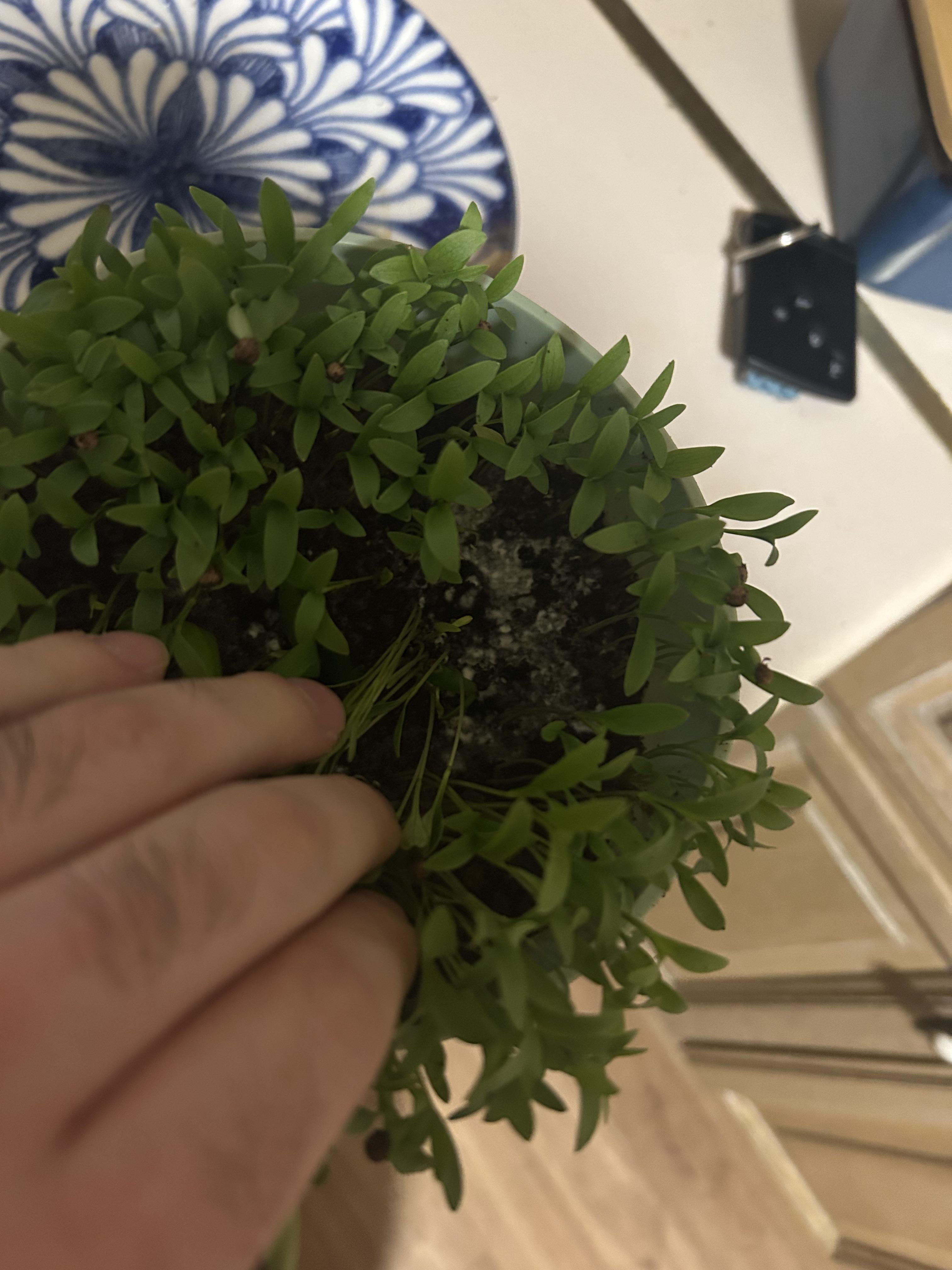 コリアンダーという植物です。調べた限りでは水やりはあまりしていませんし、水はけも良い鉢です。