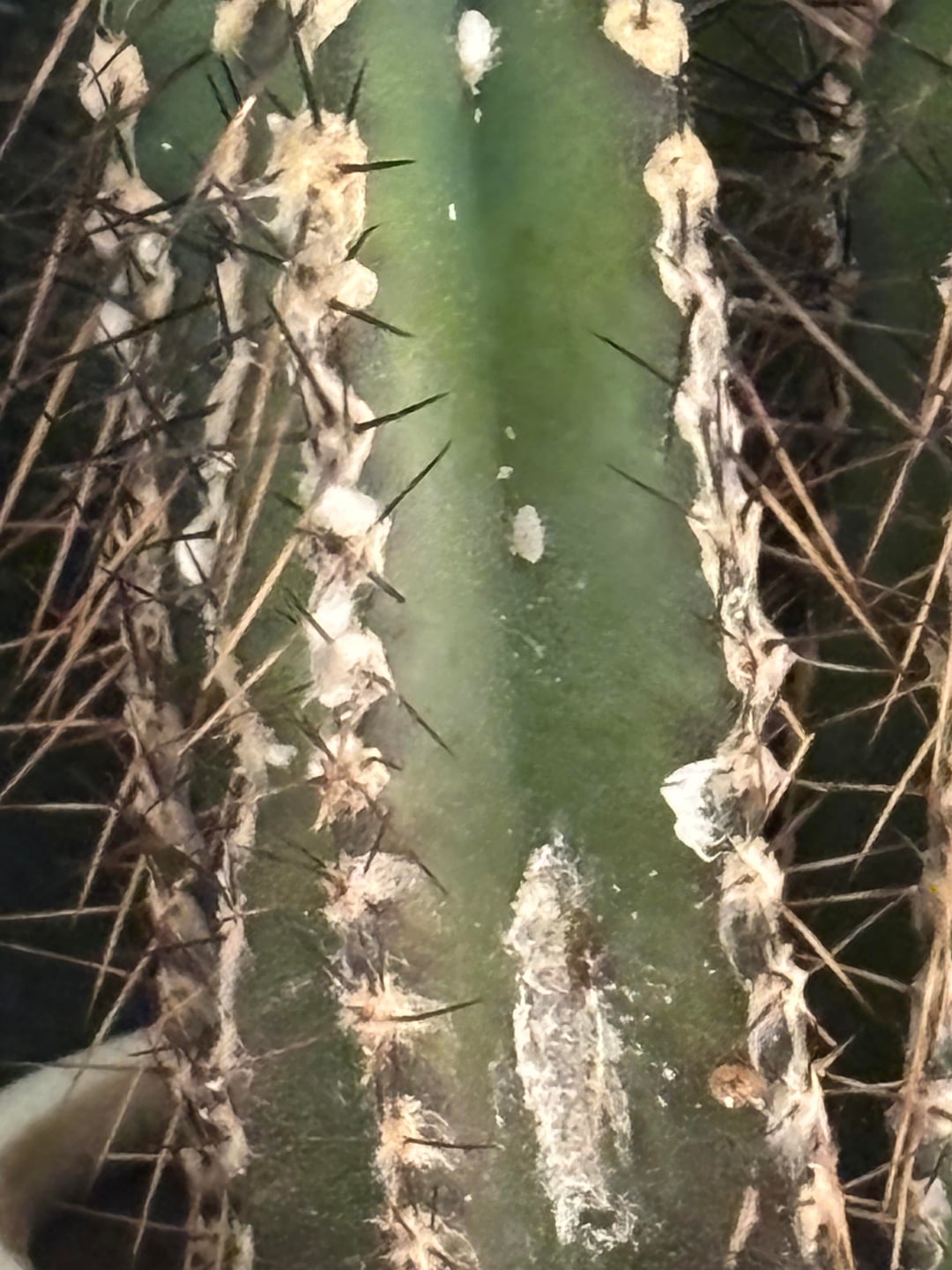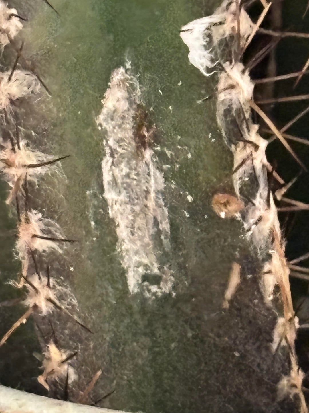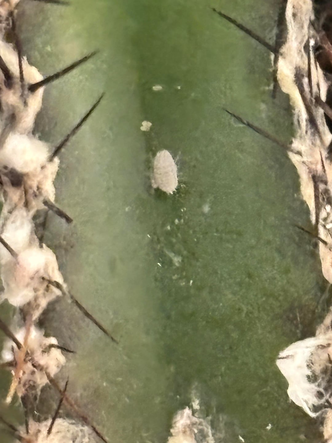 最近コナカイガラムシの投稿が多かったので、もっと詳しく見てみたいと思いました。まず、フィスボーンサボテンの糸くずを拭き取ることにしました。とても簡単に外れました。次に、赤ちゃんサボテンでも同じことをしようとしましたが、トゲトゲしすぎました。そこで白いものをピンセットで剥がすという素晴らしいアイデアを思いつきましたが、なんだかあちこちに汚れがついてしまいました。ズームアップした写真を何枚か撮りましたが、そのうちの 1 枚は間違いなくコナカイガラムシのように見えます。卵を産むと死ぬと読んだので、動かなかったのです。