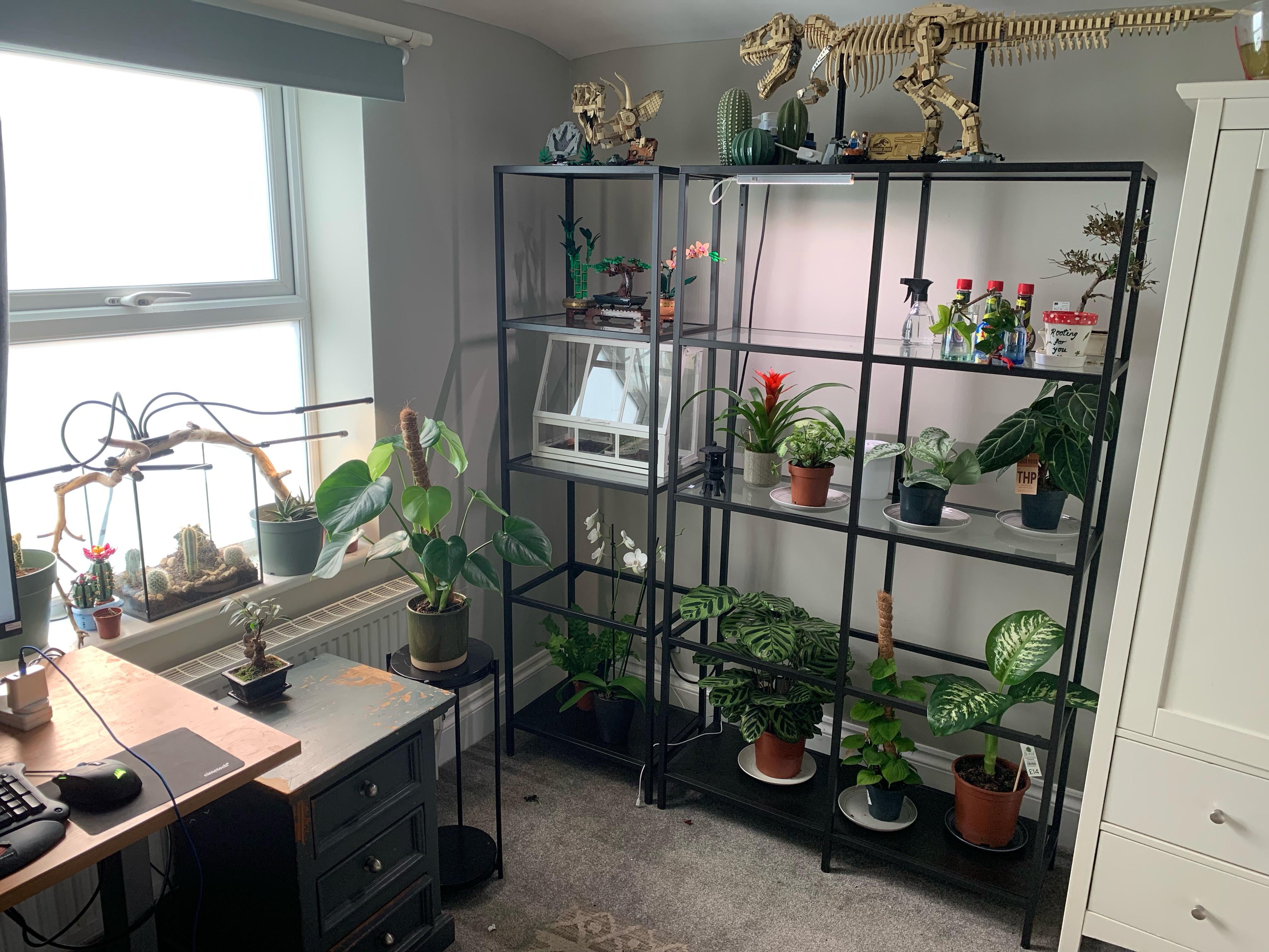 私が求めているアドバイスは、植物の位置を植物育成ライトや加湿器 (中央の棚) に近づけるべきか、それとも遠ざけるべきかということです。さらに、私は成長ライトの直下に置くことができる、高湿度と光を愛する植物を探しています。