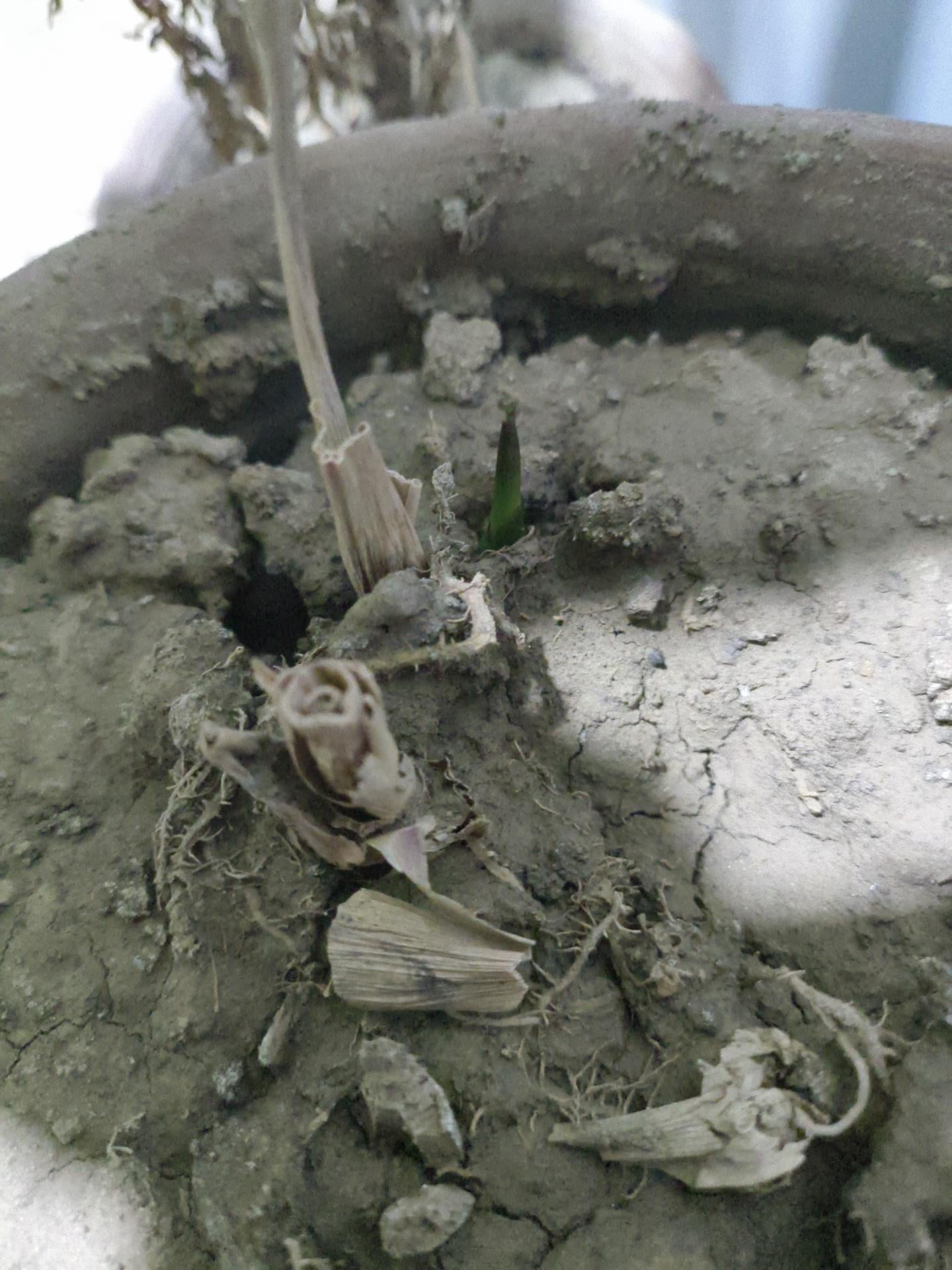 カラテア・オルナタから小さな緑色の芽が出てきました。枯れたと思って1か月以上水を与えていませんでした。