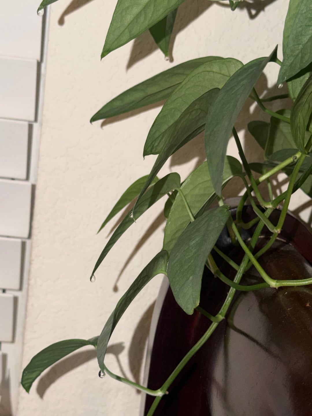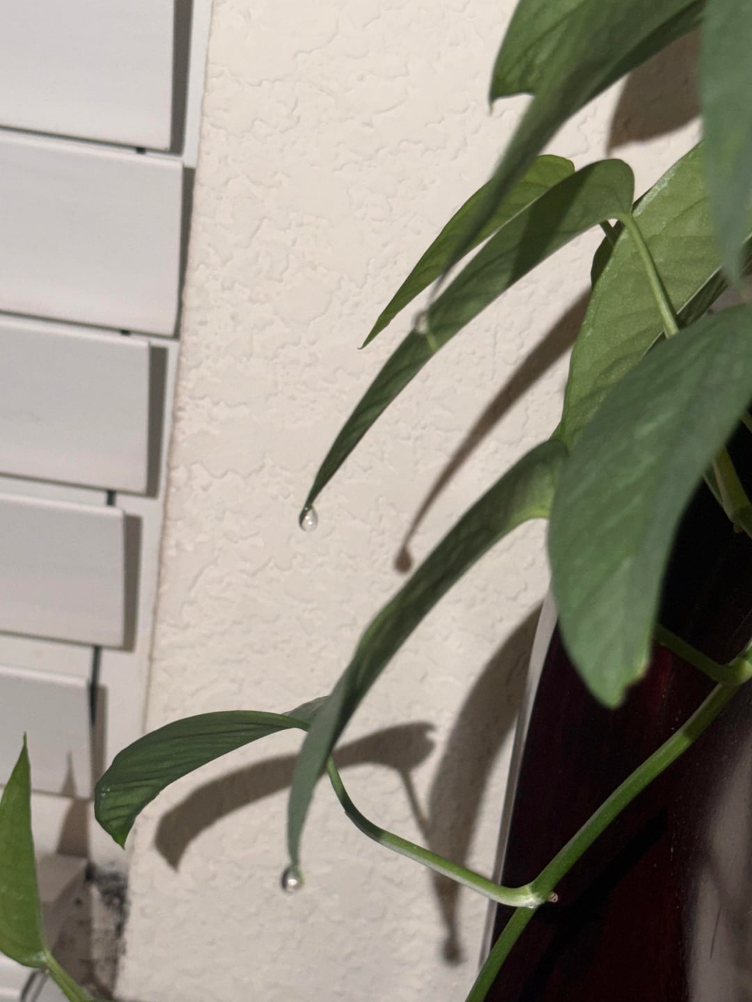 多くの植物にとって、流出は正常で健全なプロセスであることは承知しています。通常、これはクワズイモとエピプレムナムの植物で主に見られ、通常は1〜2枚の葉です。しかし、セブブルーの葉の大きな塊に浸出液が見られるとは予想していませんでした。私は通常、週に一度彼女に水をやります、そして、彼女の葉は2枚になり、ある種の浸出が起こっています。昨日、彼女に水を与えて肥料を与えましたが、今夜、彼女のほぼすべての葉の先端に水滴が垂れ下がっているのが見えました。私のセブブルーが健康で元気に育っていることをとても誇りに思います。これを皆さんと共有したいと思いました。 🌱🪴