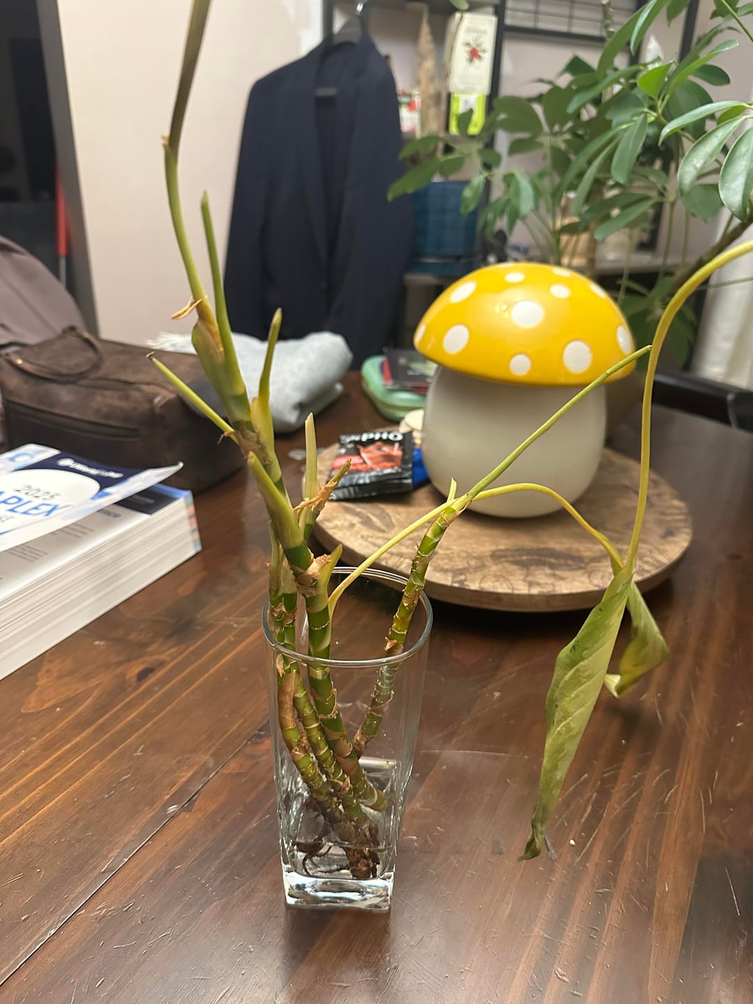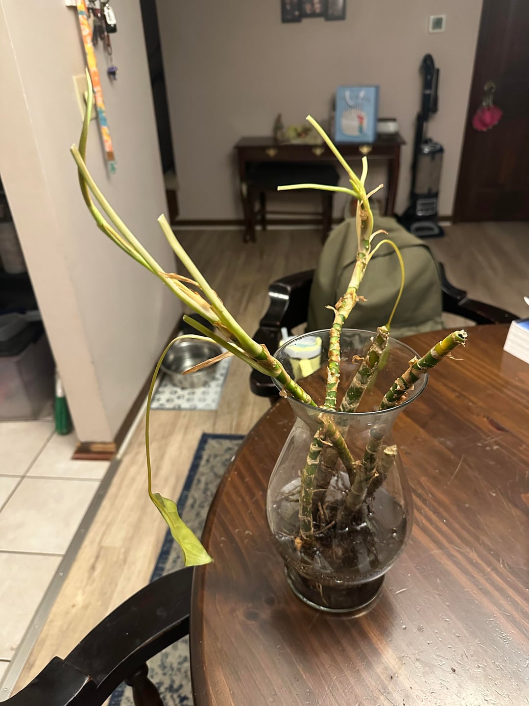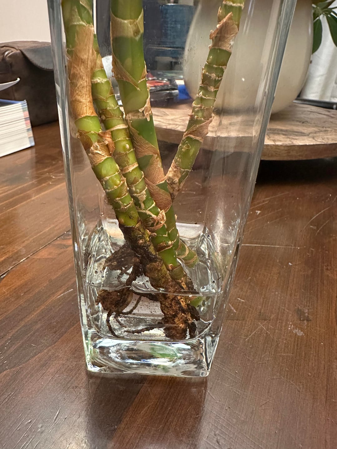 何が起こっているのかを知るために、土からそれを取り出しました。根はまだかなり無傷のようで、ほとんど根がなかった部分にさらに根が発達することを期待して、水に置きました。根こそぎにしている間、枯れた部分、どろどろになった部分、腐った部分をすべて切り取りました。残っているものはすべてまだ健康であるようで、大きな破片の端にはいくつかの新しい成長さえあります。しかし、残っているものはごくわずかで、現時点では自分が役に立っているのか、それとも状況を悪化させているのかは正直わかりません。