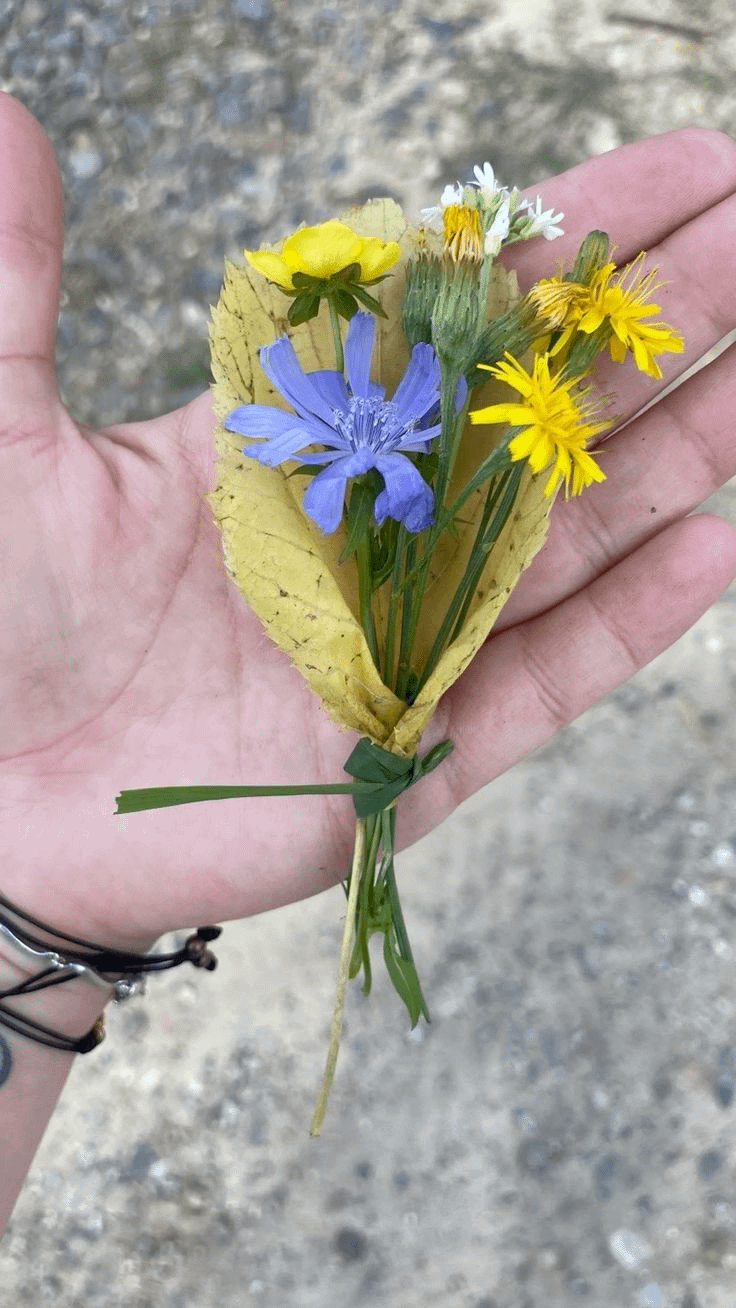 自然の小さな花束、秋の黄葉に包まれた野の花
