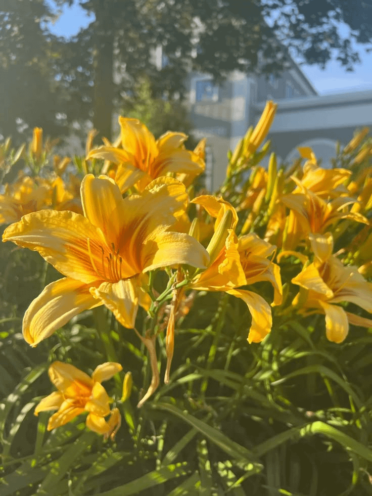 黄金色の輝きを浴びながら、これらの鮮やかなユリは、太陽の光をいっぱいに咲かせています。