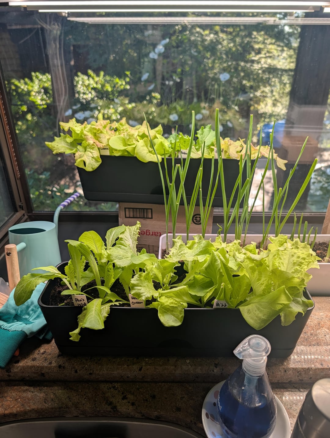 グローライトのある出窓の庭でレタスとガーリックグリーンの最初の収穫!