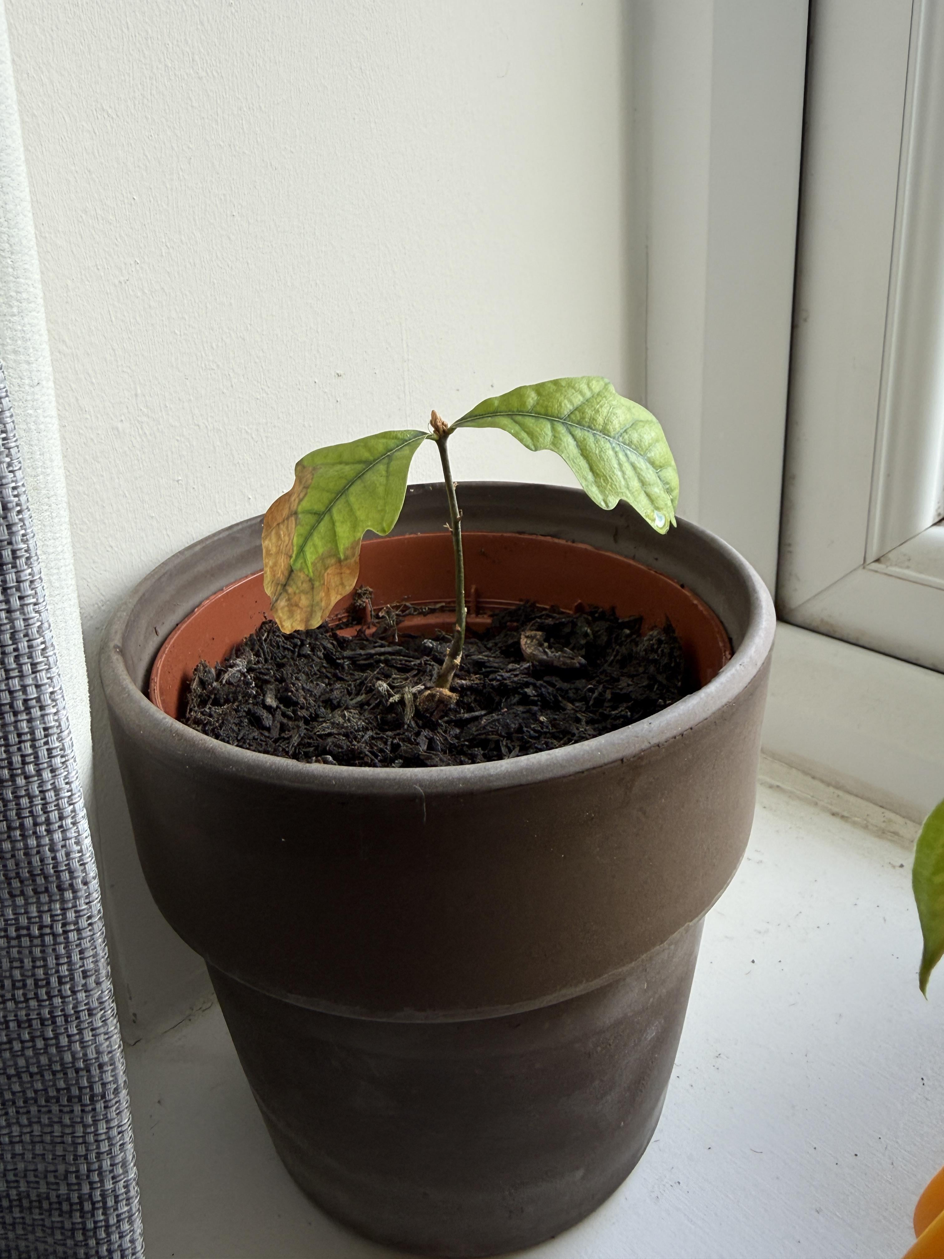 こんにちは、助けを求めているイングリッシュオークです。10月にドングリを見つけてから始めました。 ずっと小さな鉢で元気に育っており、1月から葉が出て日光を楽しんでいます。3月初旬に写真のものに植え替えました。それ以来、日光が増えたにもかかわらず、左側の葉がゆっくりと茶色くなってきました。 ヒント、アイデア、助けをいただければ幸いです。木を枯れさせたくないのです。
