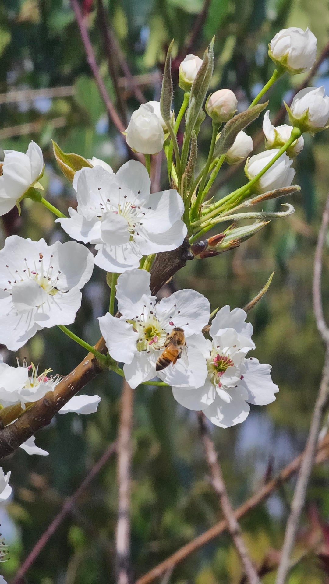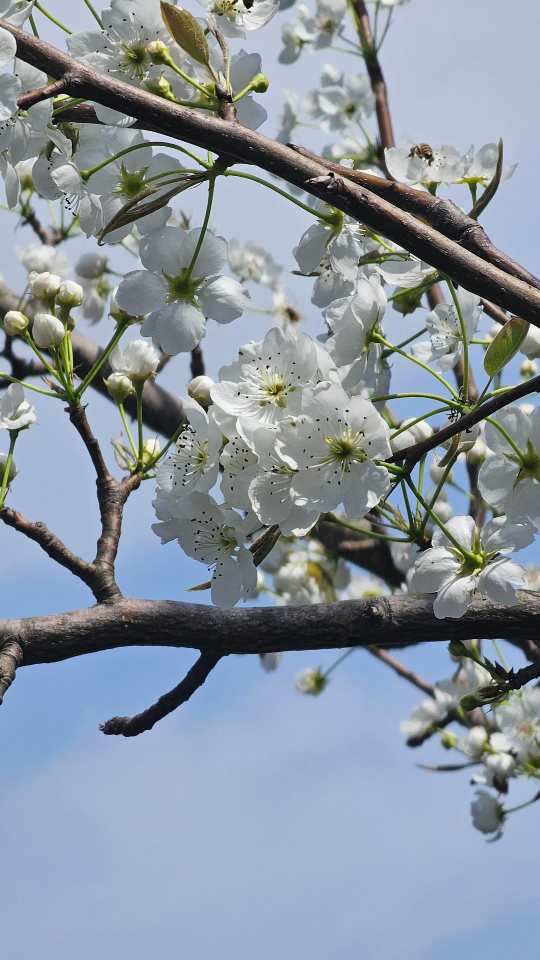晴れた午後に道端の野生の梨の花を撮影しました。柔らかい白い花びらが明るい青空に映え、小さなミツバチがフレームに完璧な小さな生命感を加えている様子が気に入りました。 私の意見では、春の最も過小評価されている花です。 #梨の花 #春の花 #自然写真 #花 #蜂