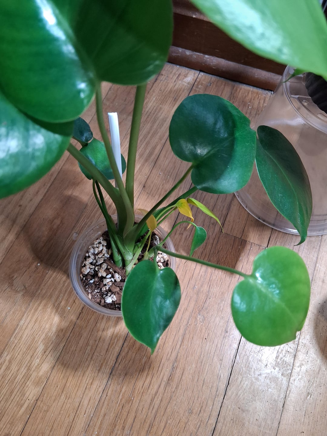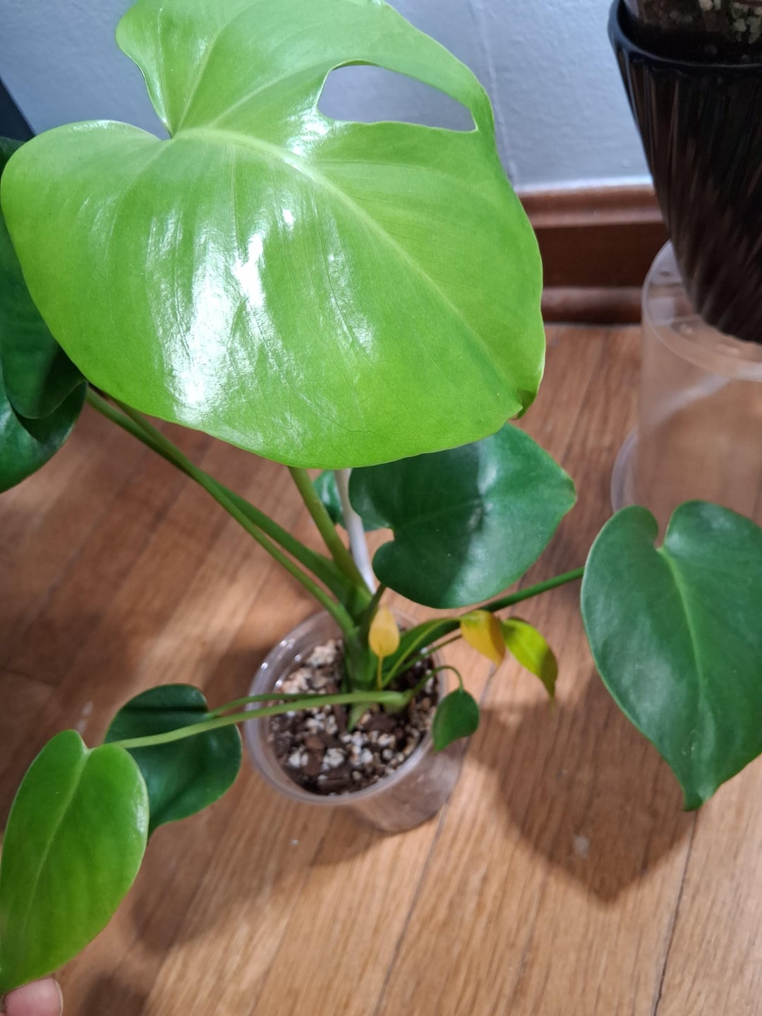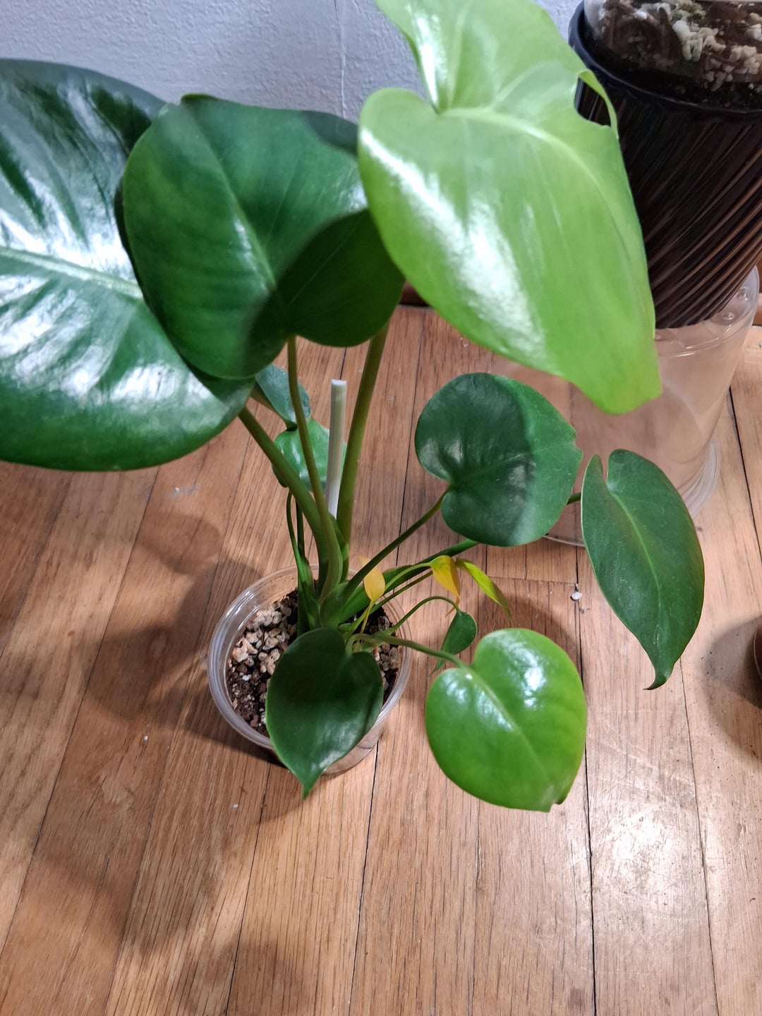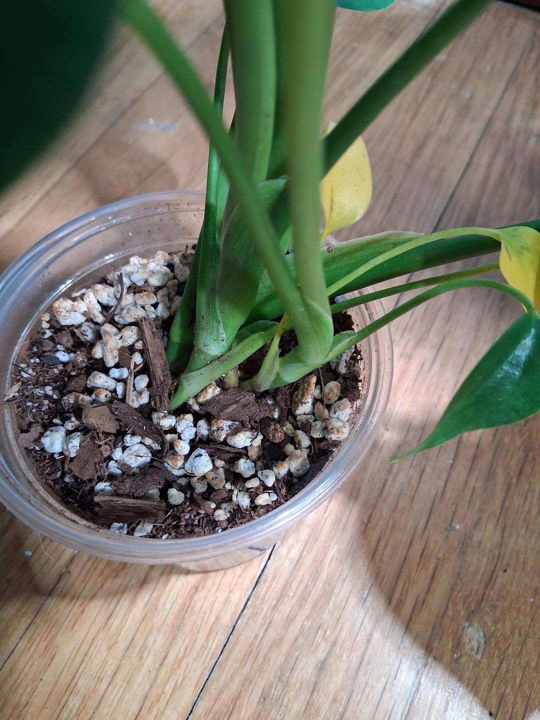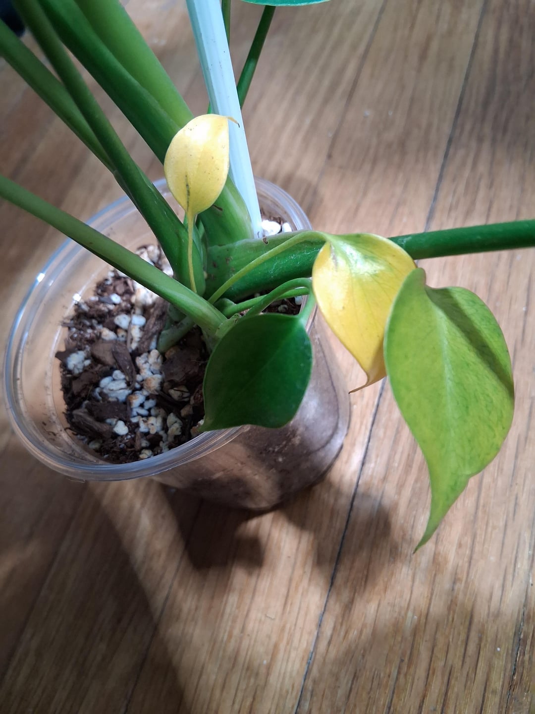 私は彼女の赤ちゃんの葉が明るい黄色に変わっていることに気づきました。小さな葉が枯れるのは正常であることが判明するためにいくつかの調査をしました。しかし…今朝、彼女の大きな葉も黄色くなり、しおれ始めているようです。モンステラをいくつか同じ培地で鉢植えにしていますが、この女の子用の容器のパーライトが茶色がかったオレンジ色に変わってきています。他の植物のパーライトはすべて白色です。葉の黄ばみと何か関係があるのでしょうか?彼女はおそらく根腐れを患っているのでしょうか?私は彼女を約10本の植物が入った容器から切り離し、彼女専用の小さな透明な鉢を用意しました。物事は順調に進んでいて、彼女は新たな葉を広げ、物事は見えてきました👌。 10 日後に早送りします。葉が黄色くなり、少し枯れてきました。助けていただければ幸いです。彼女はとても小さいので心配です。何かする必要がありますか?私は彼女を約1フィート離れたサンシ製LED 32W成長電球の下に1日12時間置きます。培地が浸からずに湿るまで、底から水を与えました。