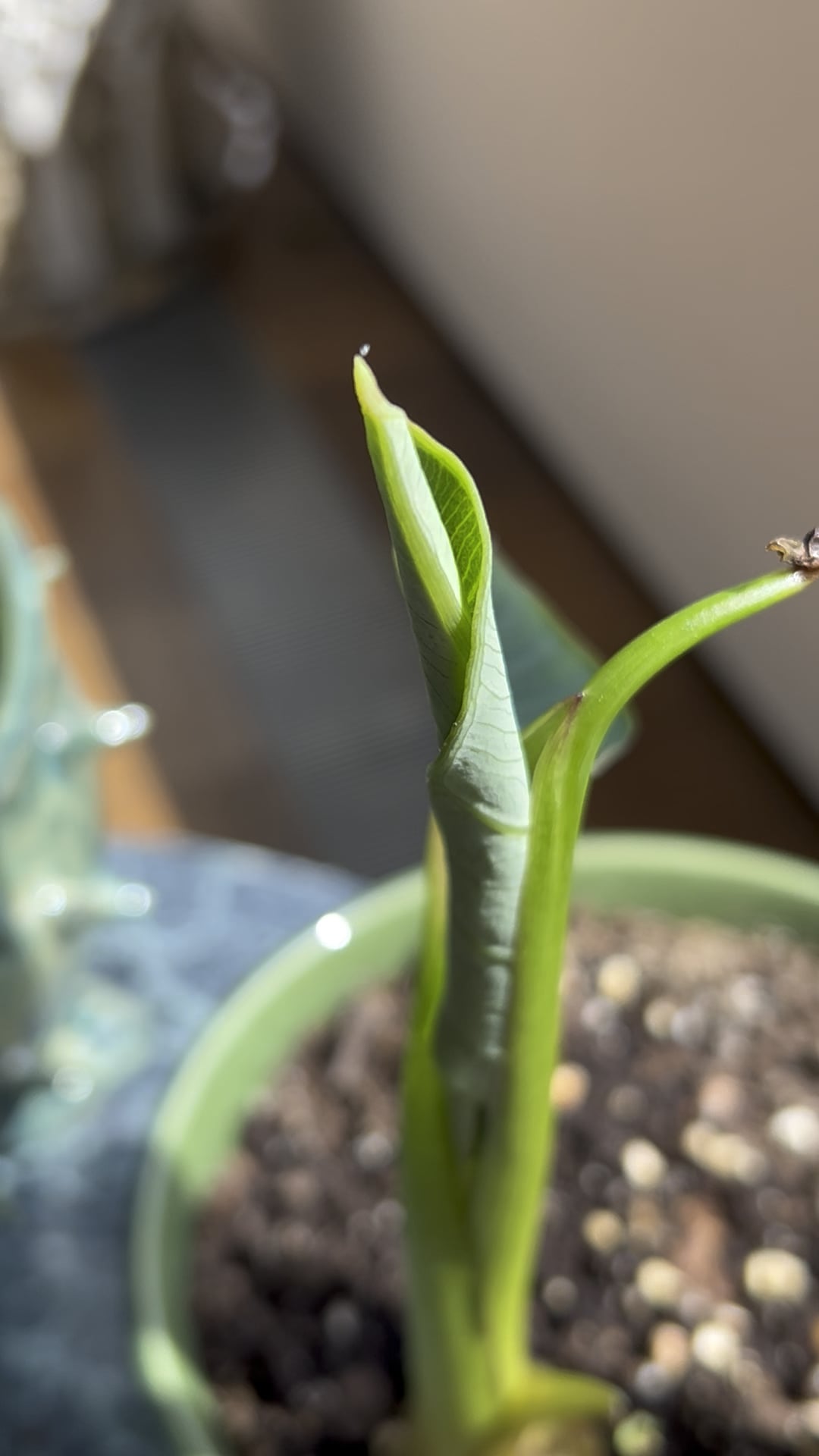 今年の初めに食料品店で里芋を買いました。小さな植物に育てました。 今日、水をたっぷり飲み、暖かい日差しを浴びた後、新しい葉から水を吐き出し始めました。葉の先に水滴がついているのは見たことがありましたが、空中に水を吐き出す植物は初めて見ました!