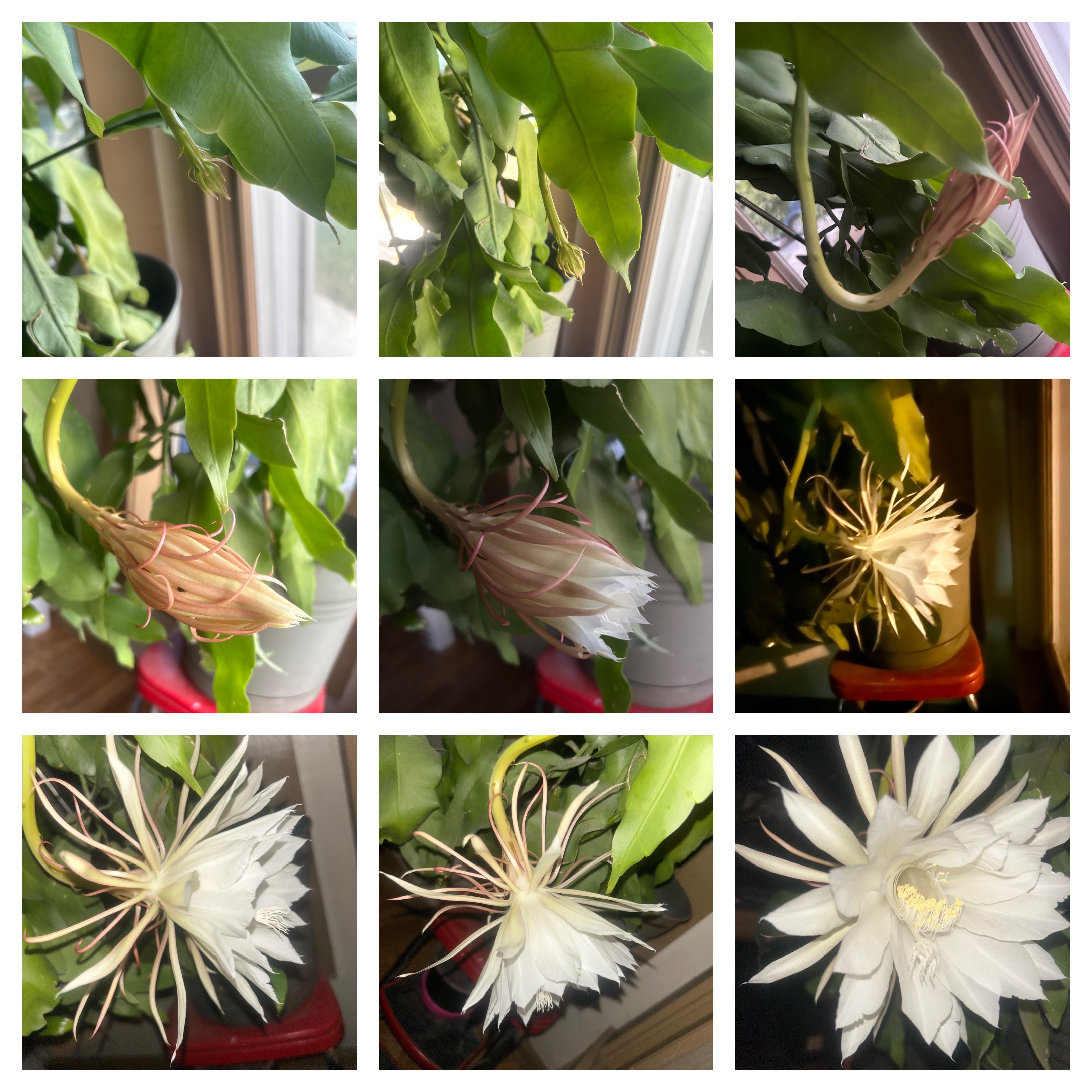 私は植物人間ではありませんでした。彼女まで。 彼女は、大きくなりすぎた半ガロンのアイスクリームバケツの中で立ち上がろうとしていて、とても悲しそうに見えました。何なのか分かりませんでしたが、家に持ち帰って鉢植えに植え替えました。 2年後、彼女はついに一輪の花を咲かせました。嬉しすぎて泣きました。これらの写真は7月のものです。 年に一度一夜だけ咲くそうですが、10月になるとまた咲きました。その時数えてみたら、花は9個でした。