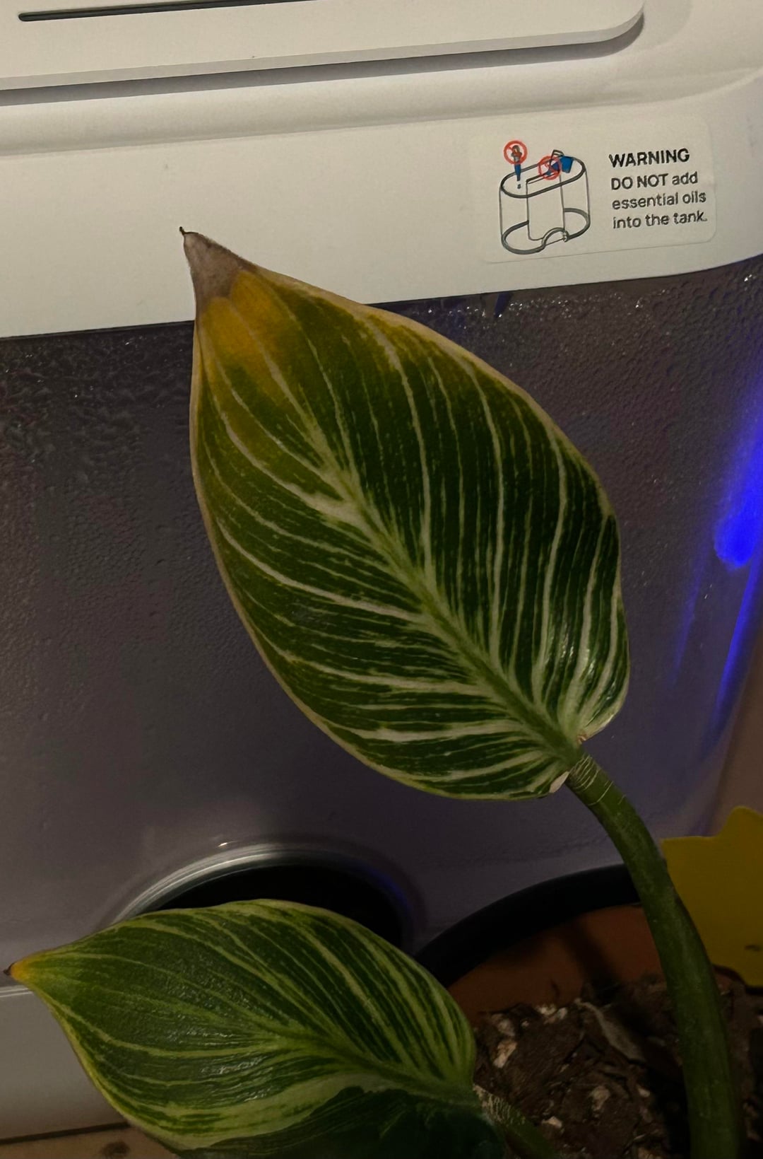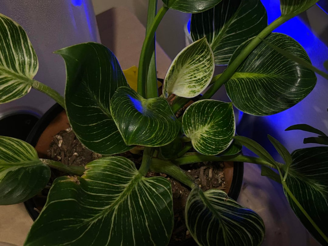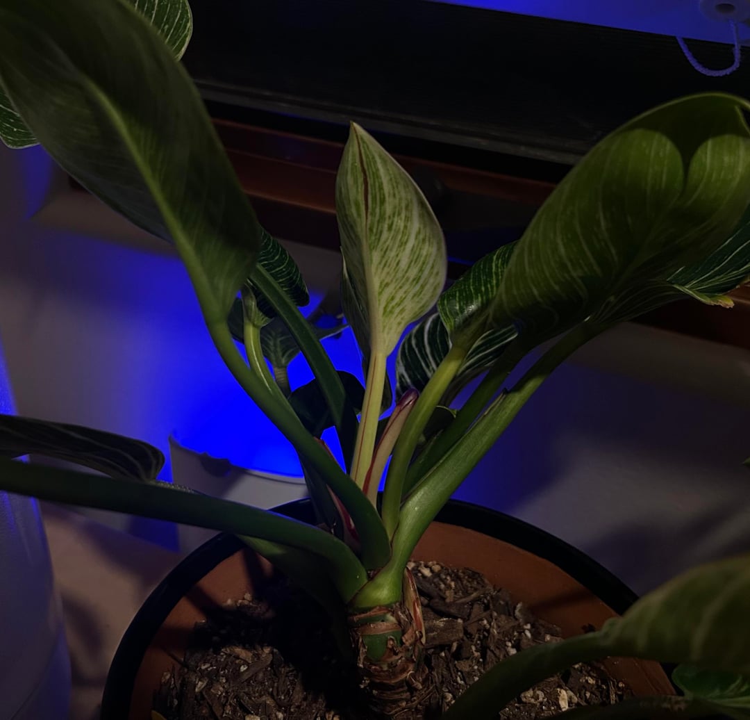 それからすぐに、さらに2枚の新しい葉が出ていることに気づきましたが、今度は別の場所からでした。 3番目の成長ではサイズはまだ比較的小さいですが、この4番目の成長では斑入りがはるかに増えているように見え、全体的な葉の色が薄くなりました。また、葉の裏側には、表からは見えない赤またはピンクの奇妙な縞模様があります。