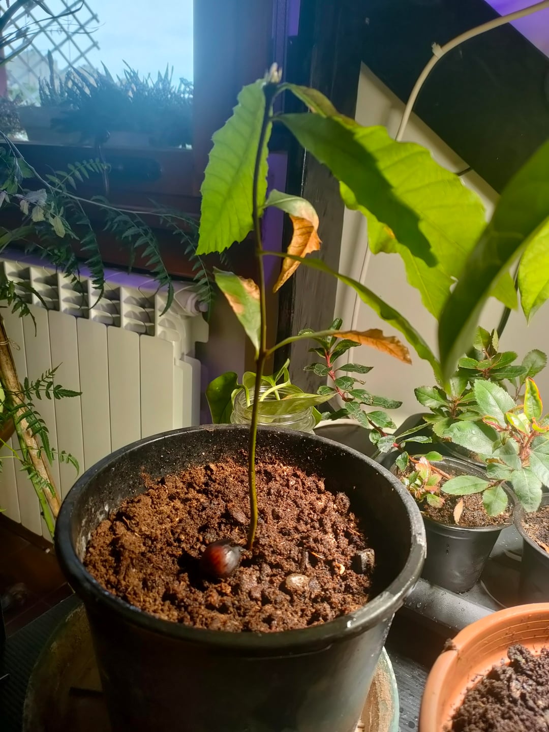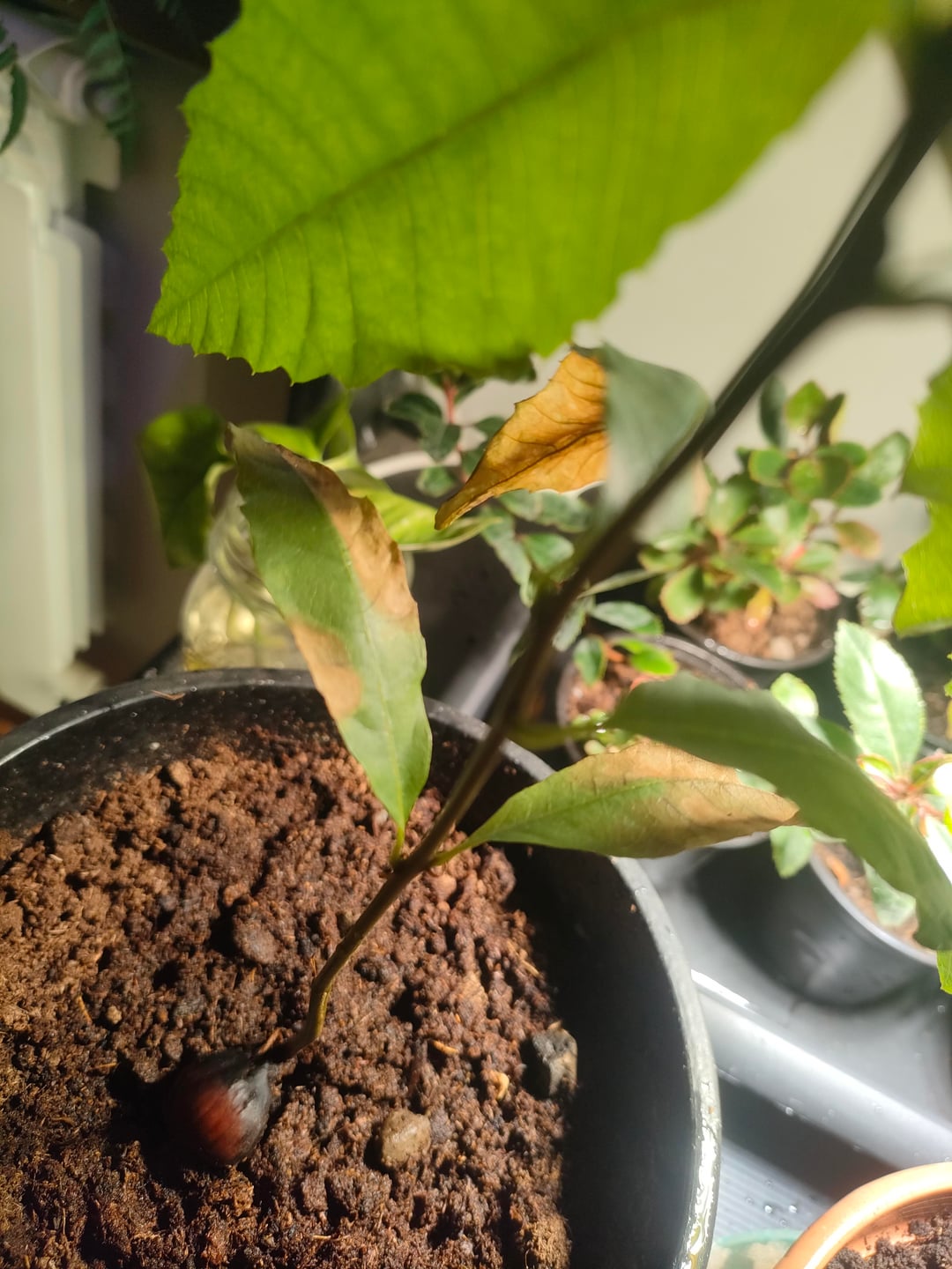 こんにちは、みんな!私の小さな栗の木には助けが必要だと確信しているので、ここに書いています。長い話を手短に言うと、何週間も待った後、なんとか栗の木ほどに成長しました。そして、UVライトの下で順調に成長し始め、もう適合しないほどになりました。この時点で完全に成長が止まりました。大きめの鉢に移し、手持ちの他のLED植物ライトの下にも移動しましたが、突然止まった後にやったので、これが影響したのかどうかはわかりません。さらに、葉が茶色くなり始めました。そして、頂上にはすでに数週間そのままの状態にある小さな葉が見えます。あなたの経験上、何が原因でそうなっていると考えられますか?そしてそれを生かすにはどうすればいいでしょうか? (2枚目の写真が醜いことに今気づきました。うーん)