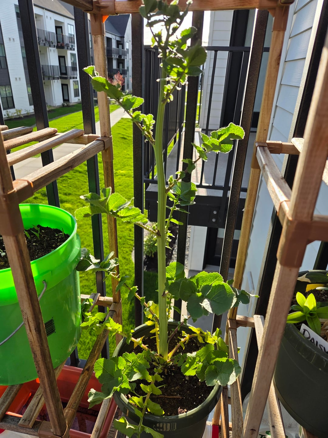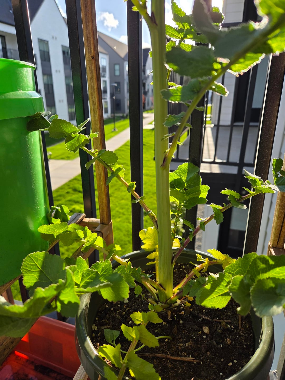 私にはバルコニーがあります "庭" そして夏の間、私はさまざまな花や野菜の種を手に入れました。そのうちのいくつかはまだ成長中です。最初は大根かと思いましたが、2フィートまで伸びて葉もたくさん付いているので、何なのかよくわかりません。ニンジン、キュウリ、ネギ、エンドウ豆をほぼ同時に植えました。それはそのどれでもない。黄色くなってきたので下の葉を切り落とします。素敵な植物ですが、何なのか全く分かりません。