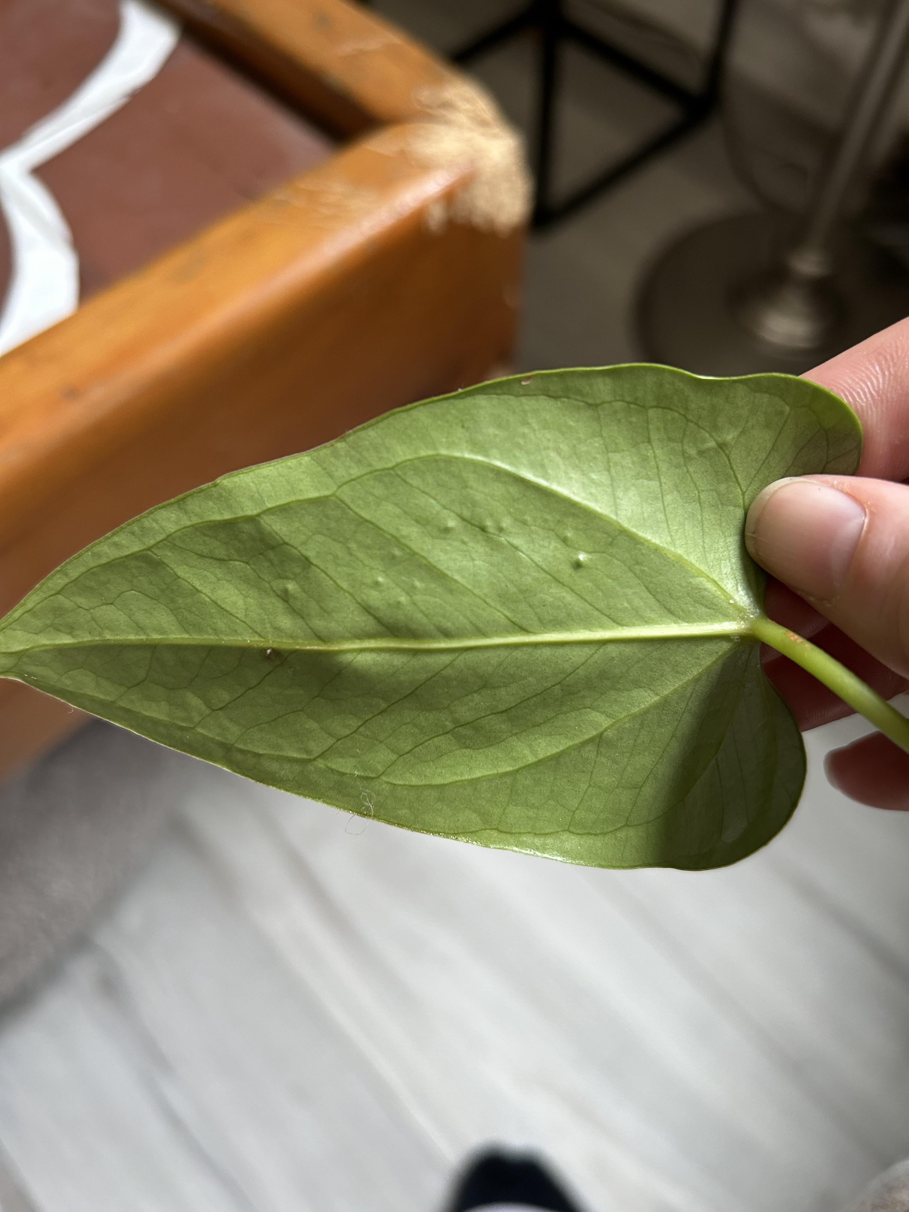 私はアザミウマに2回感染しましたが、これは同じように見えません。幼虫やアザミウマの実物が見つからないので、これが何なのかわかりません。私の赤いアンスリウムの植物から
