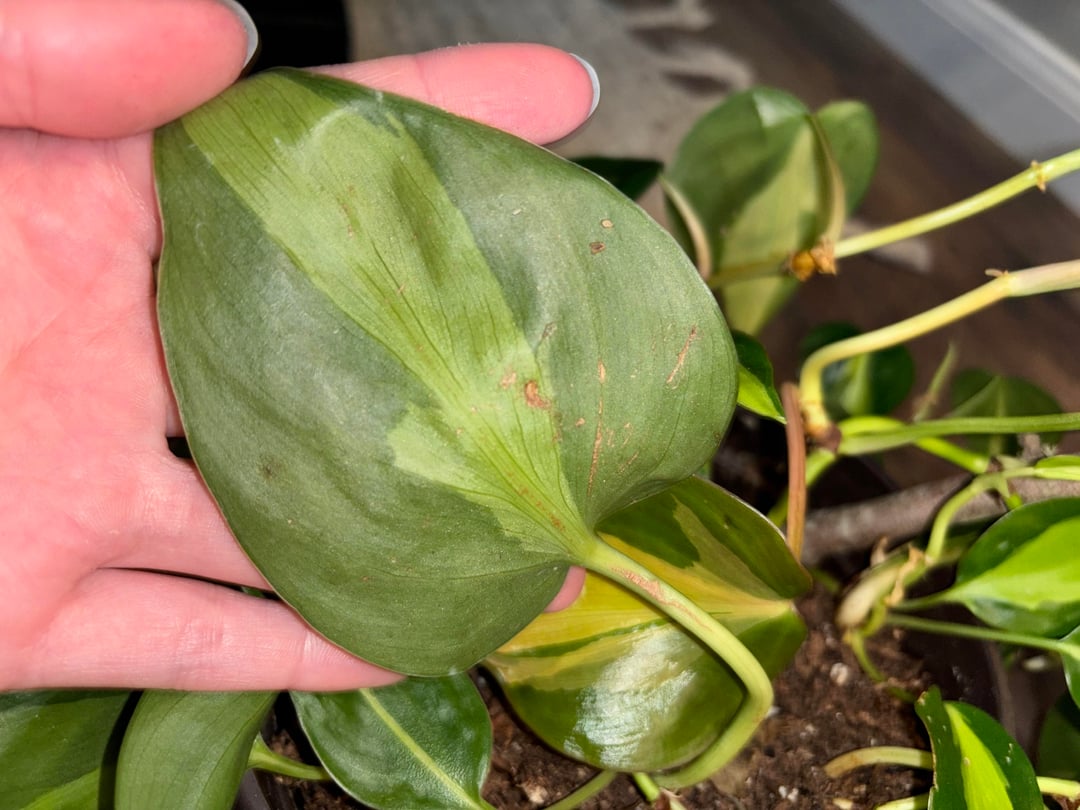 これが害虫に関係しているかどうかはわかりませんが、ブラジルのフィロの葉に跡が付いています🥲。これらはハダニとアザミウマの両方の跡でしょうか?