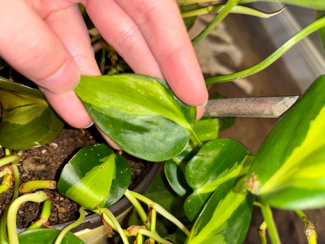 これが害虫に関係しているかどうかはわかりませんが、ブラジルのフィロの葉に跡が付いています🥲。これらはハダニとアザミウマの両方の跡でしょうか?