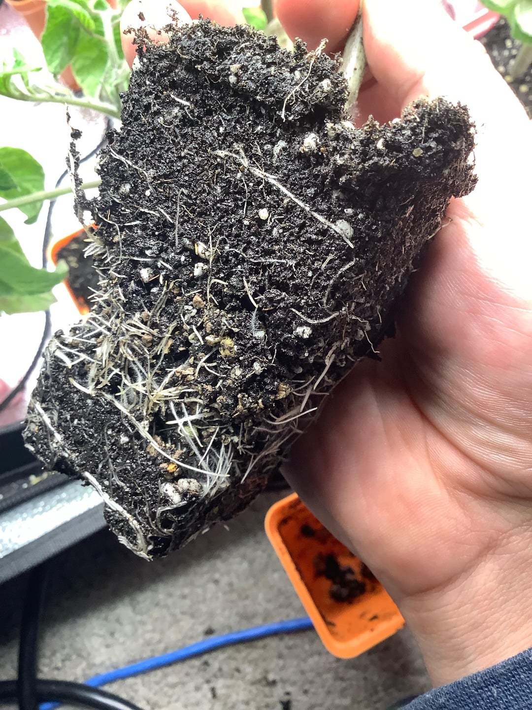 これらは、3/27 に 6 つのセル トレイからこれらの 2.2 インチ ポットに移植されました。移植中に根に菌根が適用されました。