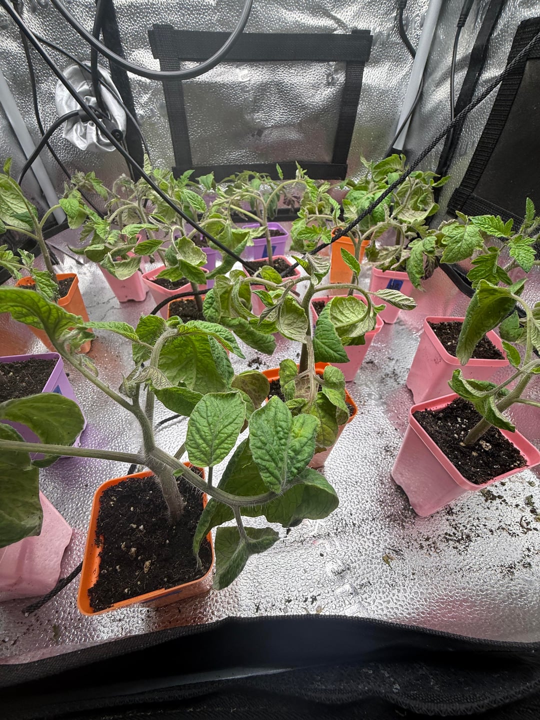 ブランデーワインのピンクと大きなピンクのトマトに合う環境を整えようとしています。彼らは全く幸せそうに見えません。