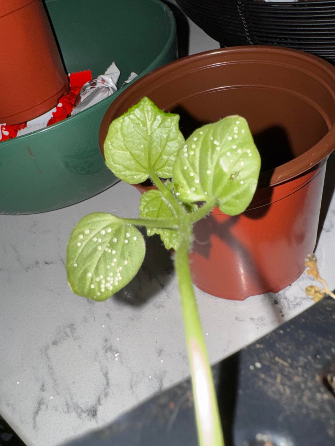 私のオクラスタートの下に何かが卵を産んだのは間違いなく、グーグルレンズは役に立ちませんでした。これが何なのか知っている人はいますか?かなり柔らかいですが、簡単に潰すことはできません。触れるものは何にでもくっつきます。このようなものはここでしか見たことがありませんが、どれも半透明ではありませんでした 🫣
