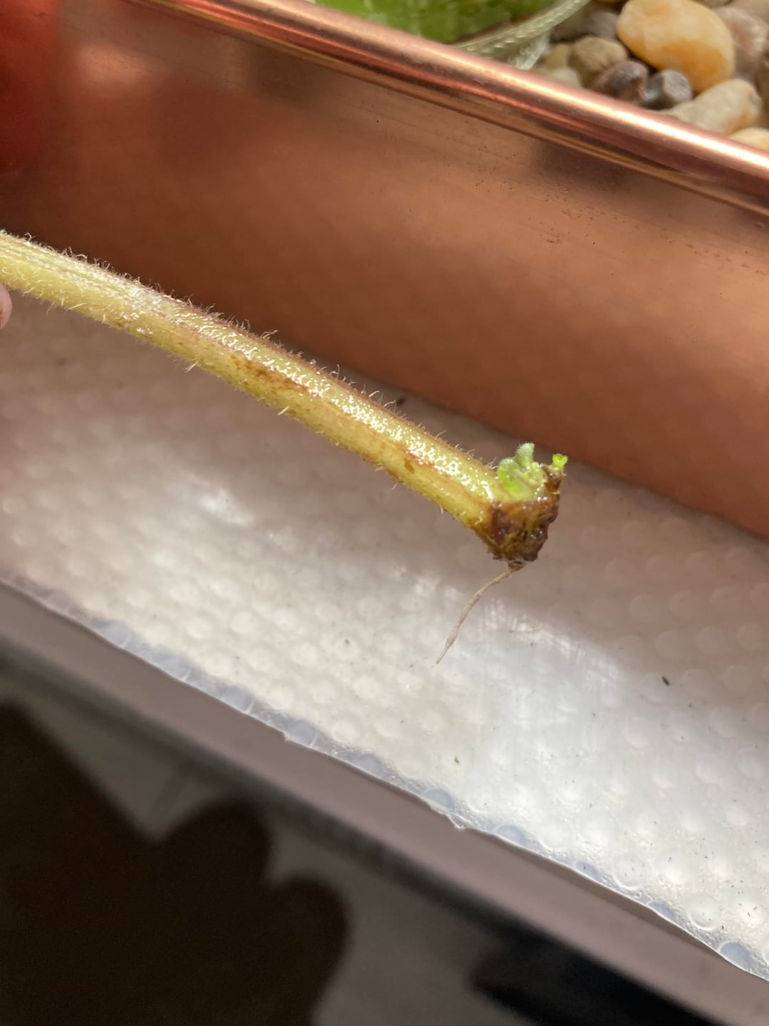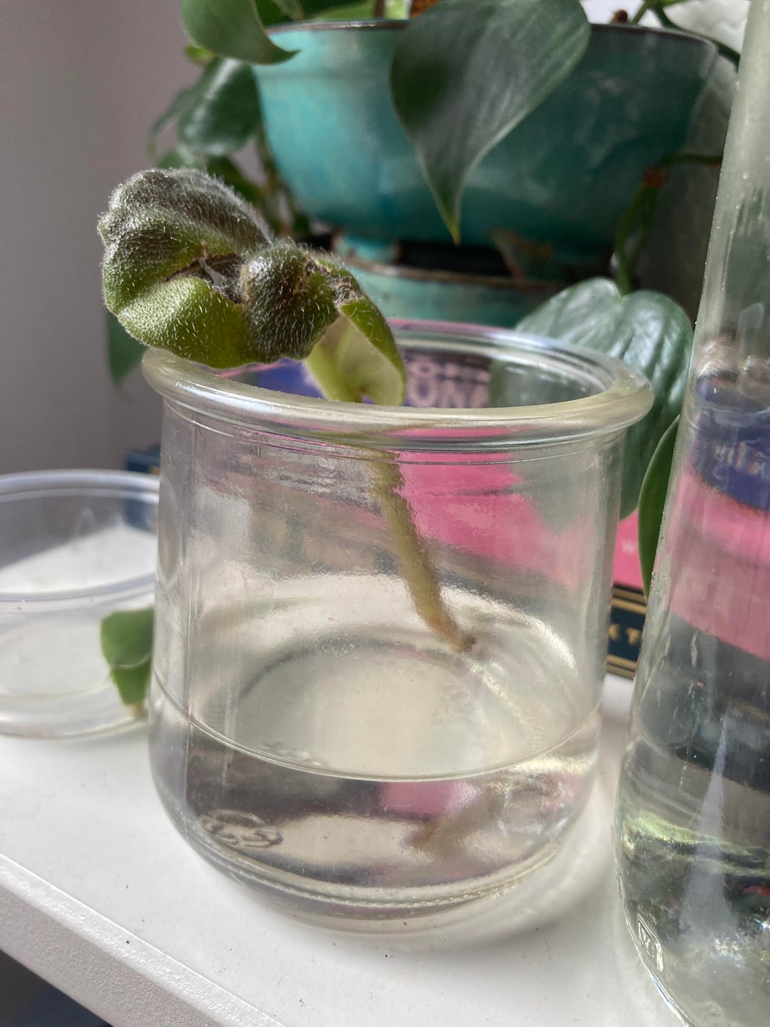 私はこの切断を4か月以上水中で行ってきました。数か月後には小さな緑の葉が現れ、ここ 1 週間ほどで 1 本の根 (よく見てください!) が現れました。