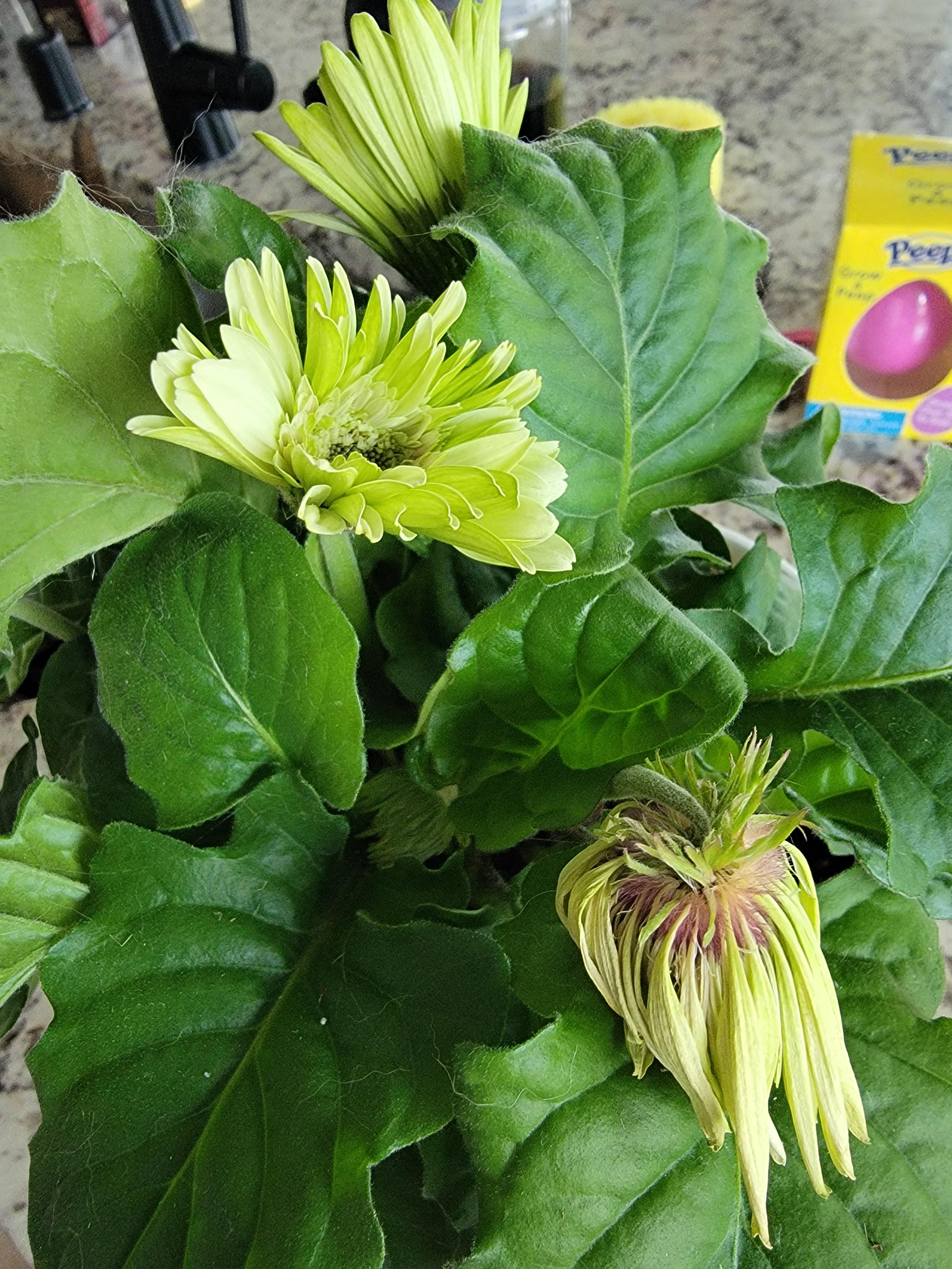 ガーベラという植物です。お花に関してはかなり初心者です。私はミネソタ州に住んでおり、今はかなり寒いですが、1週間前に購入したとき、植物はかなり健康でした。水分過剰ですか?十分な日光が当たっていませんか?