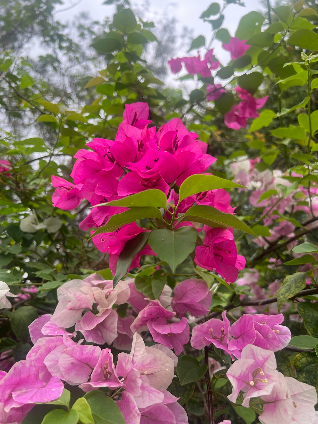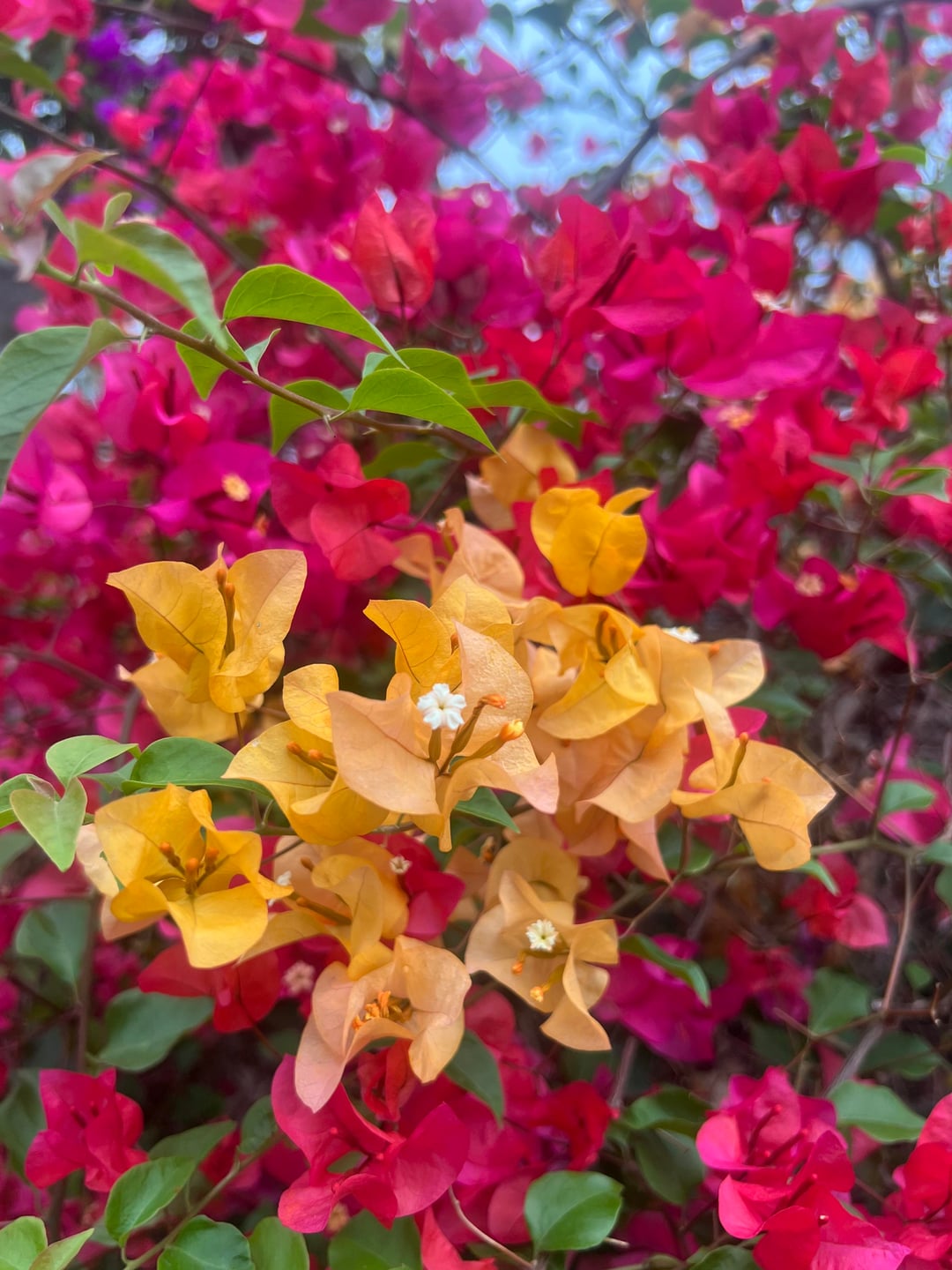 すごいですね!今日、ハイキング中に素晴らしい植物に出会いました。 この木には、ピンク、赤、白、紫、オレンジなど、さまざまな色の花が咲きます。 花のようにも見えますが、葉にも似ています。これは何の植物かわかる人はいますか?