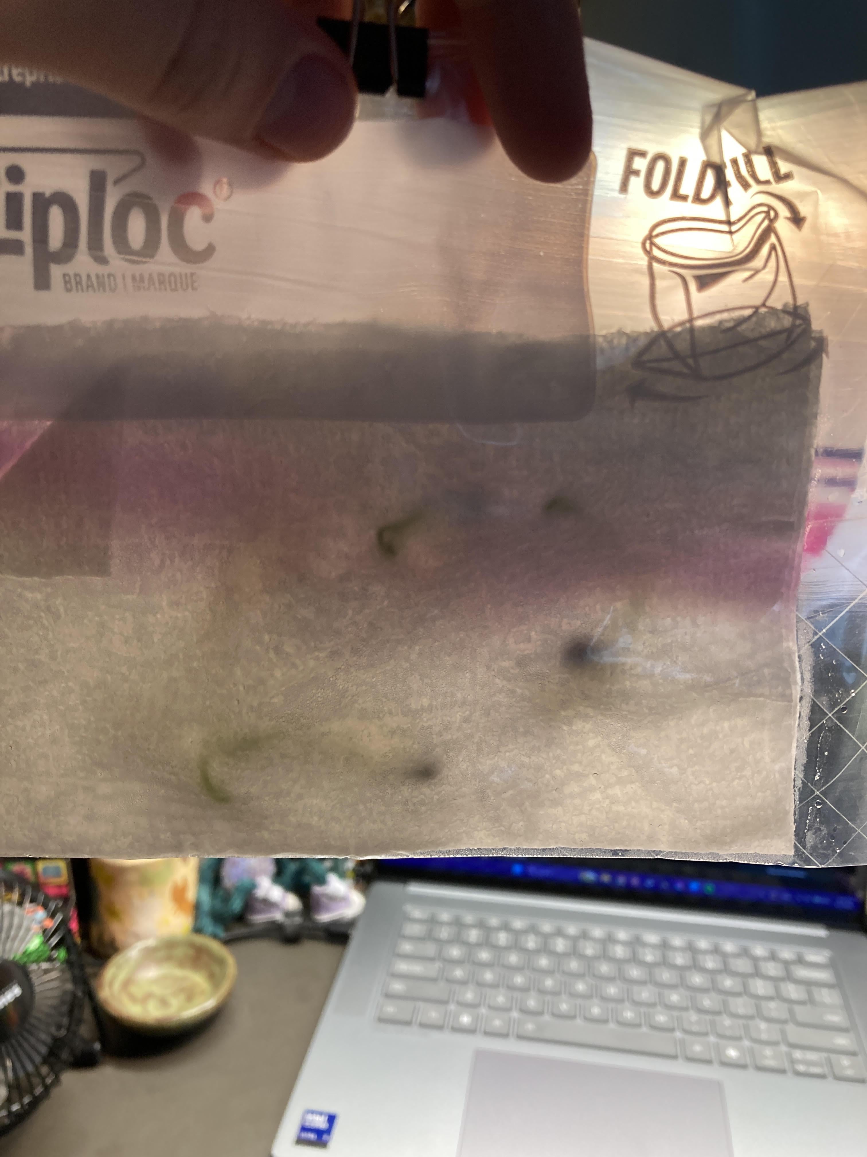 1か月後の今日、私はそれらの存在を思い出し、それらを確認しました。そして、大きなショックを受けたことに、それらは発芽しただけでなく、すでにかなり分厚くなっていて(写真を参照)、いくつかはペーパータオルに穴を開けました。