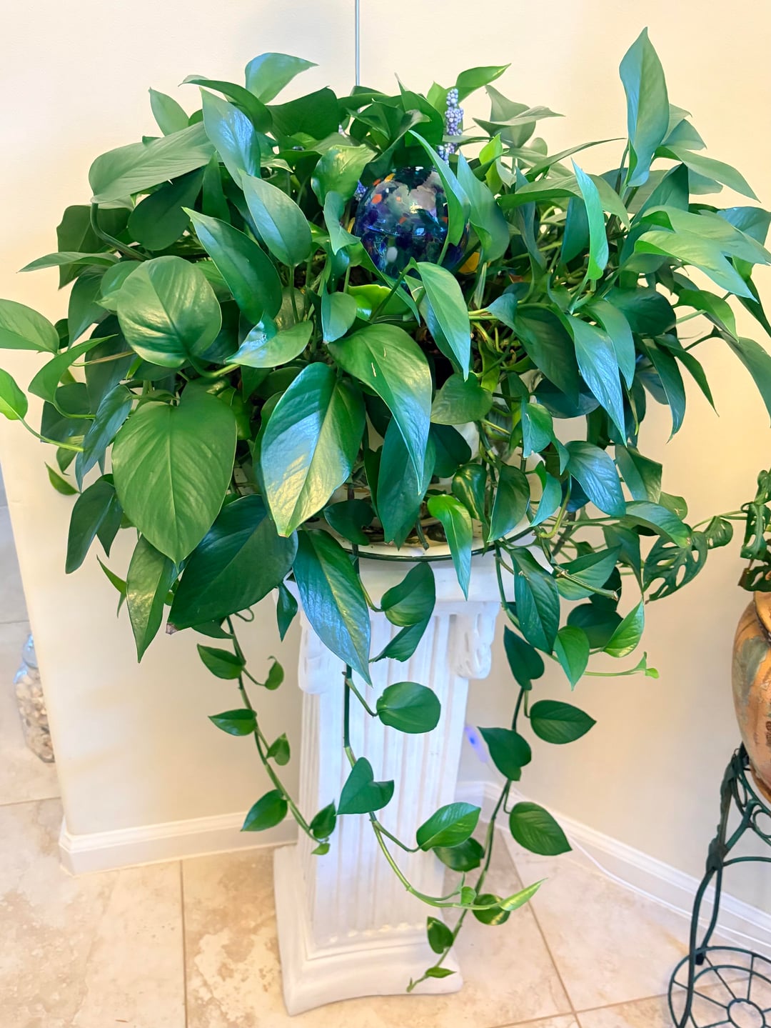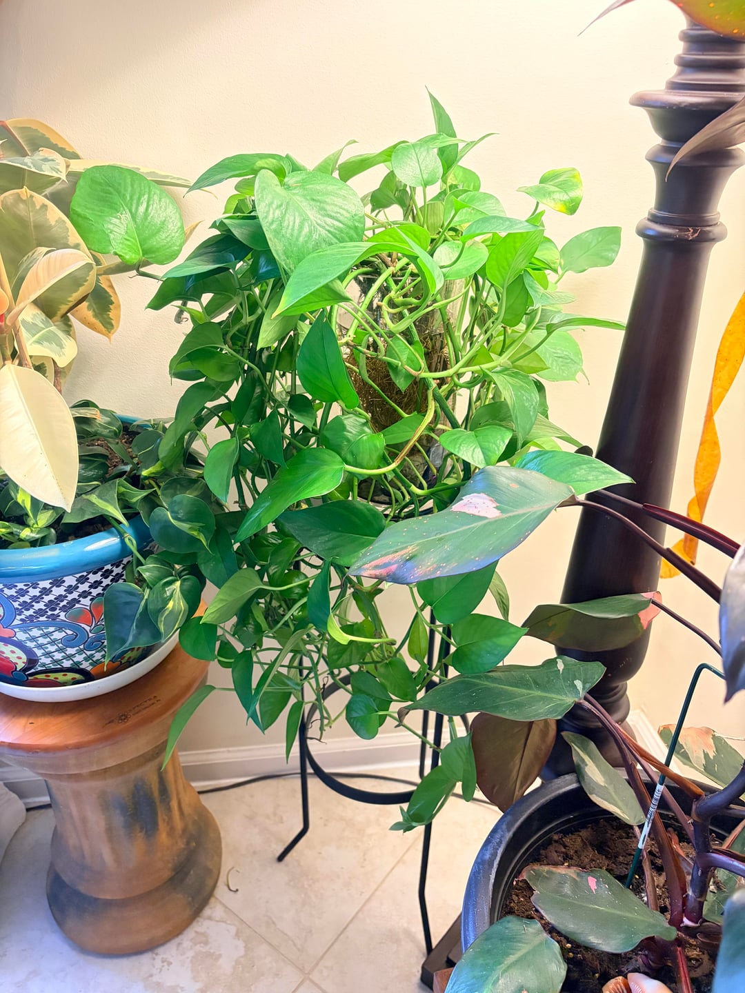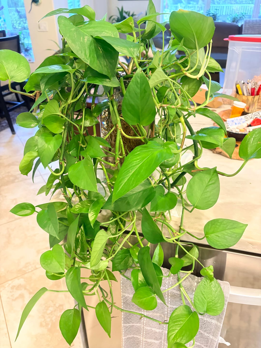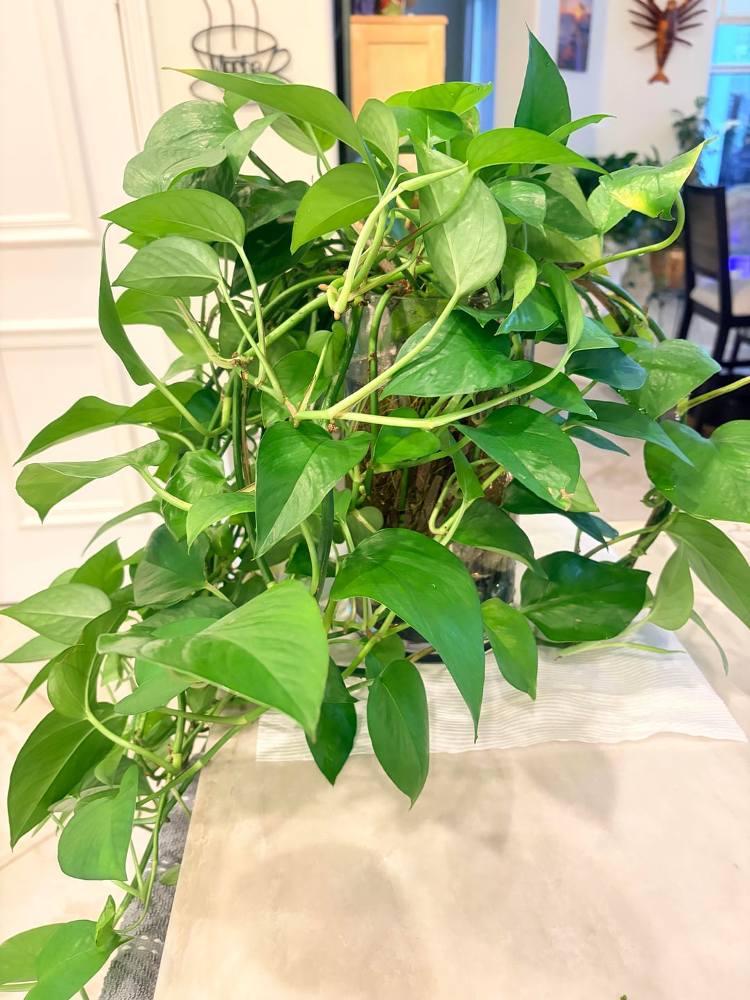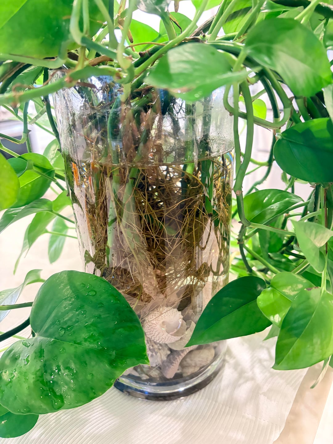 樹齢約25年のポトスを飼っています。私は植物をふさふさした状態に保つために、長い蔓を常に切り落とします。蔓の部分を水の入ったシリンダーの中に入れ、そこで一生を過ごします。約1年間ここで過ごしています。水を替えるついでに写真を撮ろうと思いました。