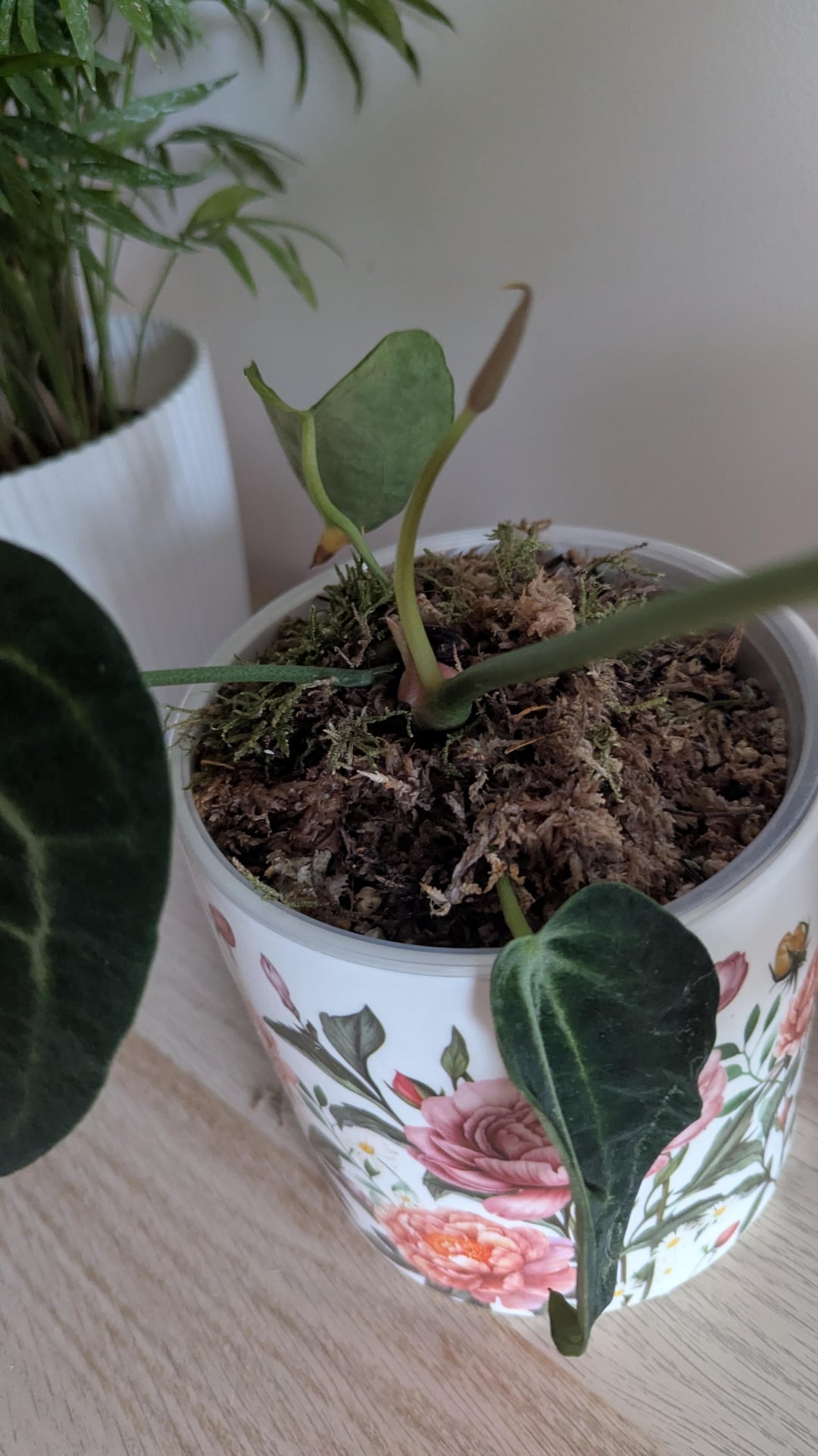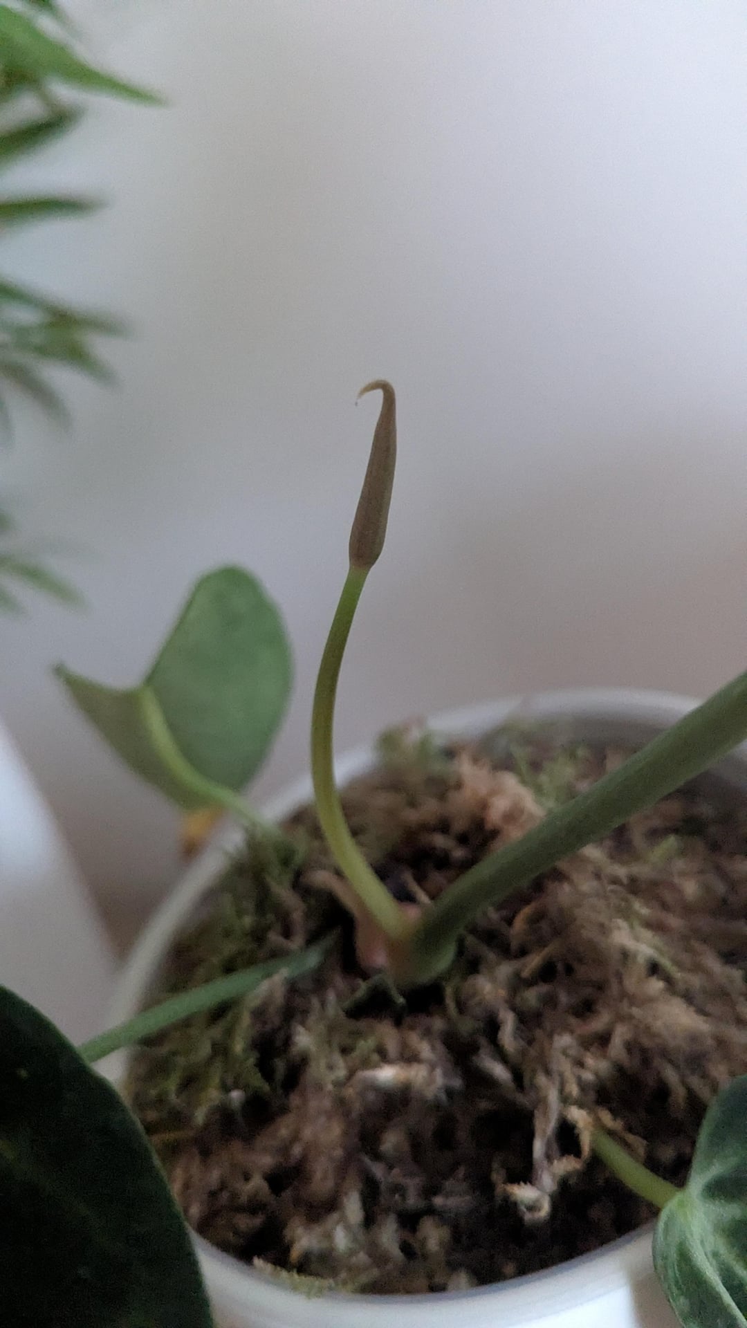 やあ、みんな! アンスリウムは初めてです。クラリネヴィウムに新しい葉が1枚だけありましたが、すぐに葉のように見え始めて、徐々に大きくなったような気がします。 今回は見た目が違うので、それがインフローかどうかわかりません – 切断する前に確認したかったのです 😅