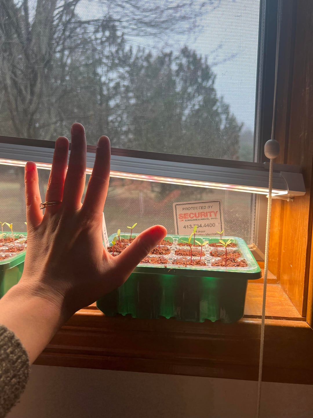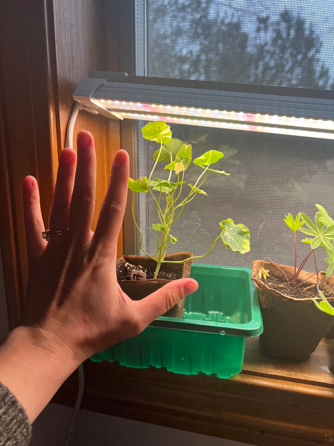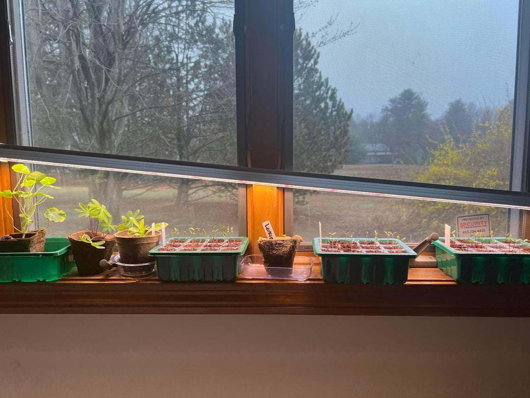 私の苗のほとんどはトマトですが、マリーゴールドのトレイもあり、3つの大きなポットは花(ラークスパーなど)です。私には背の高い苗が 1 つありますが、南向きの大きな窓辺はありません。苗トレイが光に負けていると思いますか?