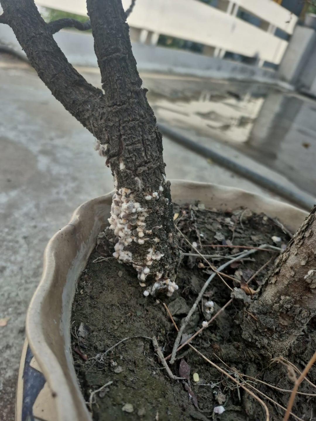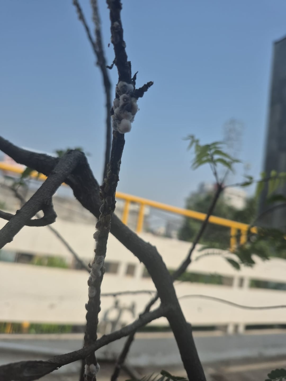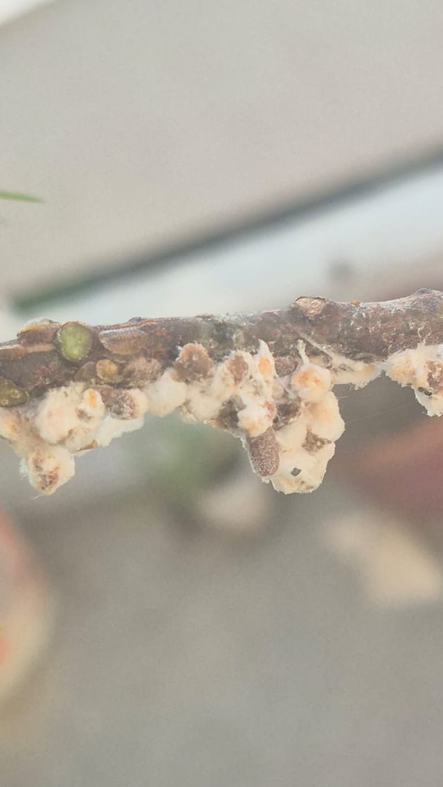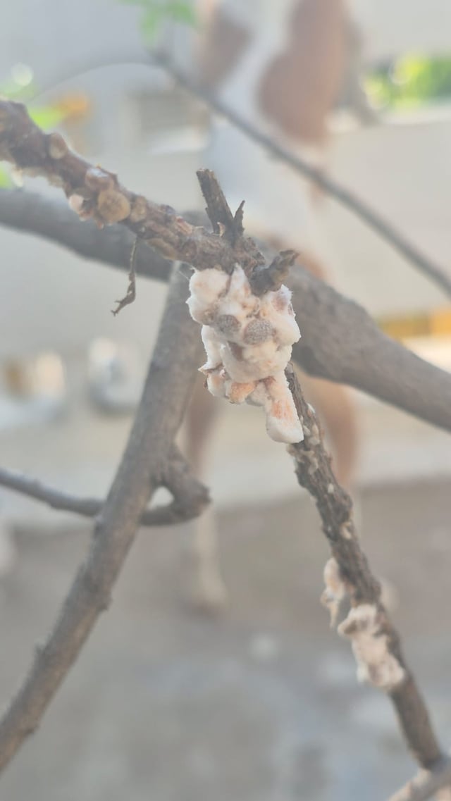 私の植物に生えているこれは何ですか、非常に早く広がり、木の部分にのみ発生します。最初の数日間はただ白でしたが、わずか4〜5日後には黄色と白が混ざりました