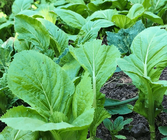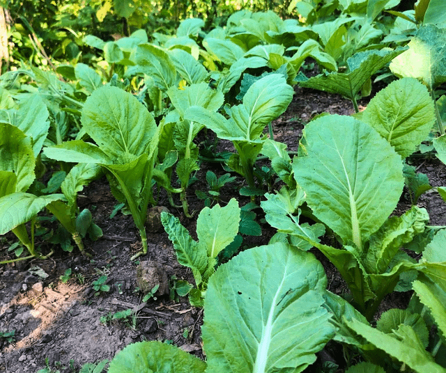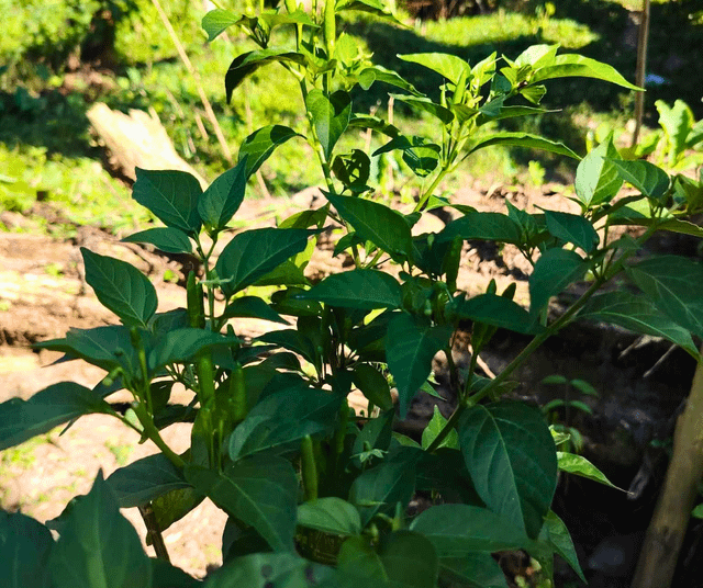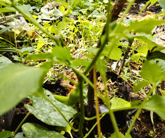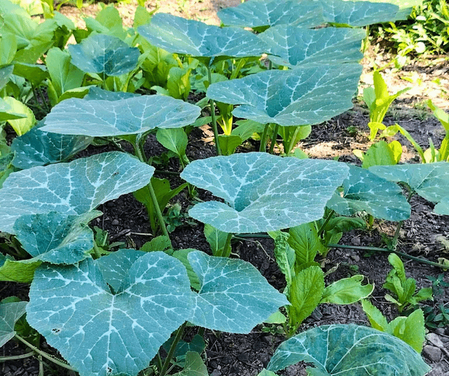 緑と成長を続けるマスタード、チリ、スカッシュの庭