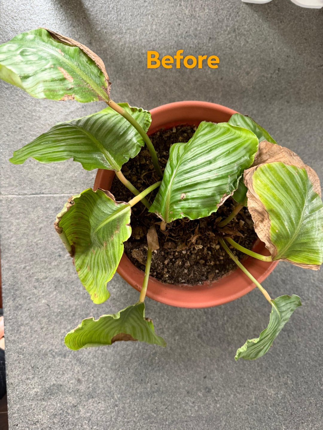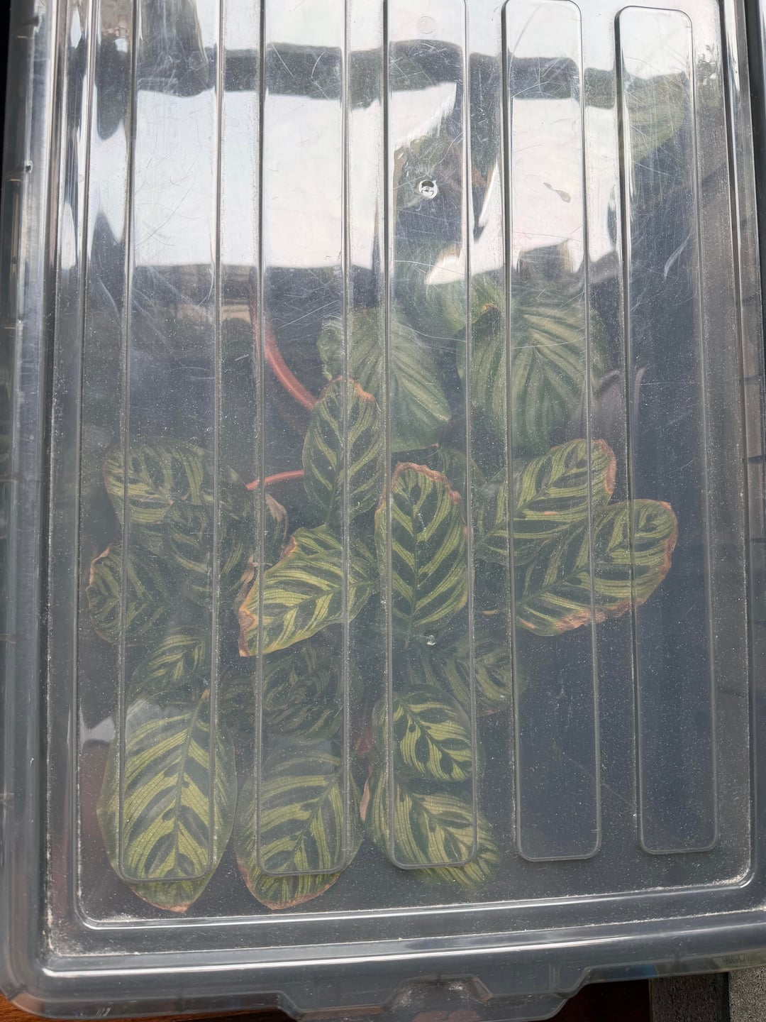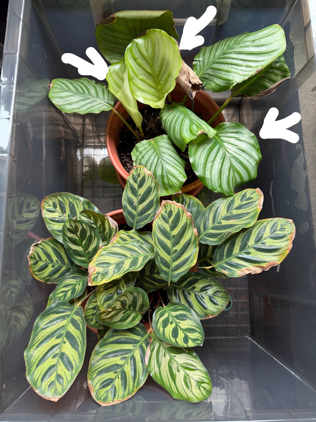 そこで、最後の手段として、不健康なカラテア・オルビフォリアに試してみました。今は箱の中で元気に育っています(毎日1~2時間箱を開けています)。新しい葉が3枚あり、とても健康そうに見えます(古い葉にしわが寄って茶色くなっているのがわかります)。ボックスジェイルを導入する前は、除湿機を備えた超乾燥したリビングルームに年中無休で保管していました。