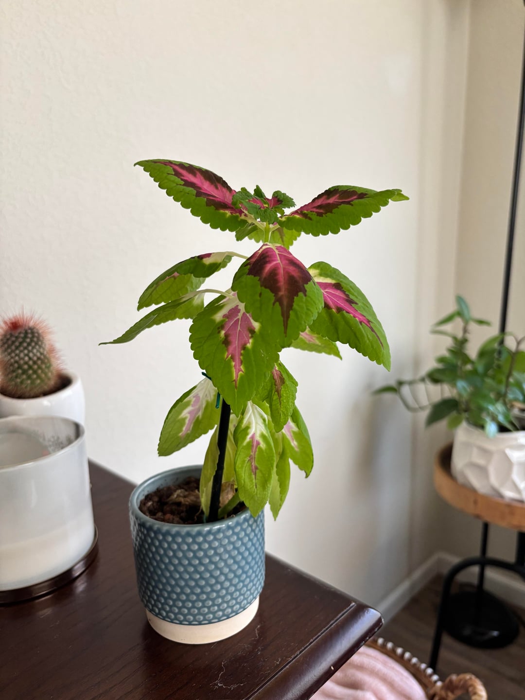 コリウス (?) – この植物は 2025 年 5 月に繁殖交換したもので、高く成長しましたが、下部の葉が落ち始めたので、上部の数枚の葉を新しい植物に再繁殖させました。これが現在のものです。この植物はもっと茂っているはずだと思いますが、明らかに私はそのために適切な条件を提供していません。本当の姿に成長するにはどうすればよいでしょうか?