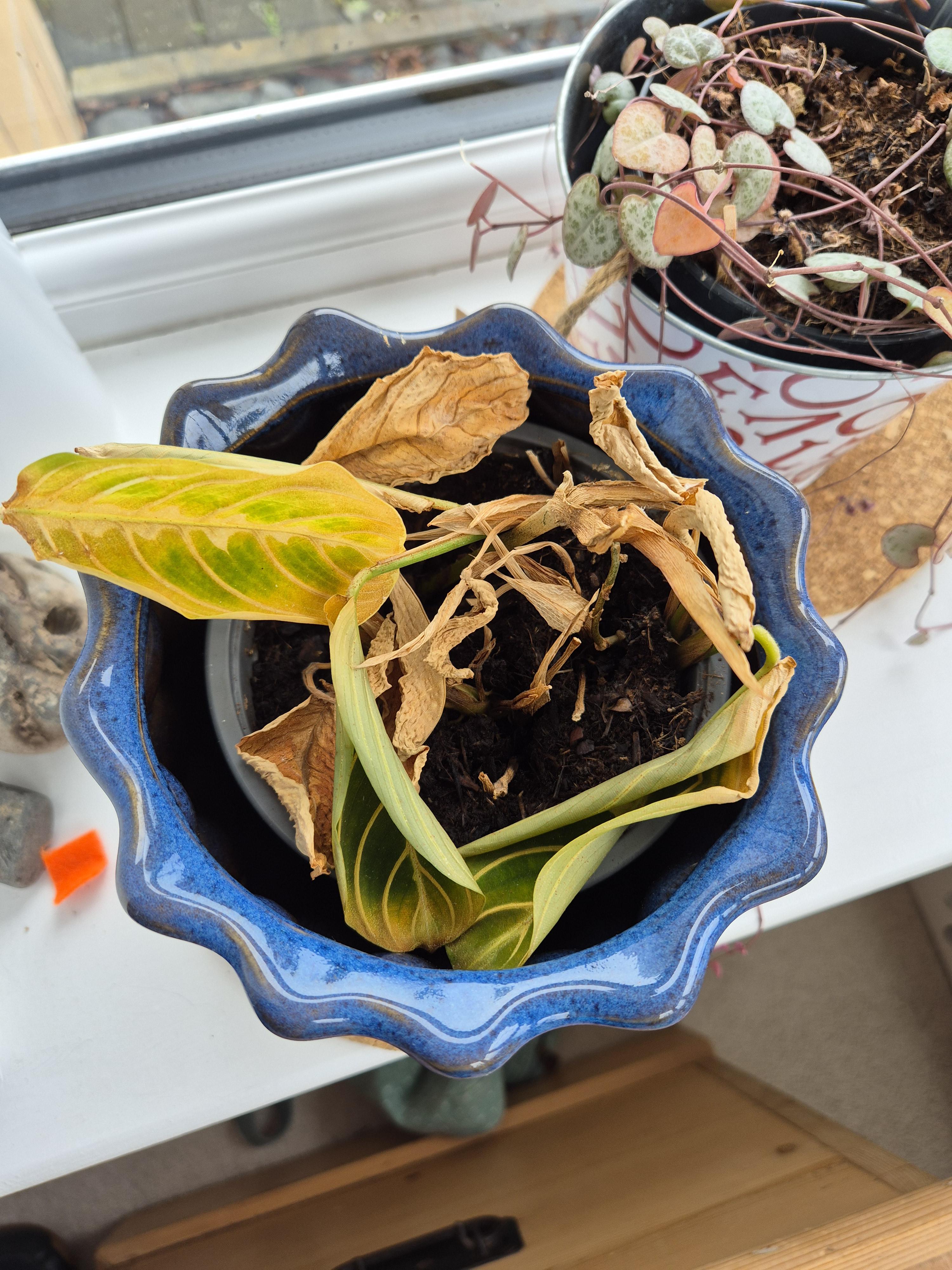 この祈りの植物を保存できますか?かなり黄色く見えます。冬の間は休眠できることはわかっていますが、これはあまり良くないようです
