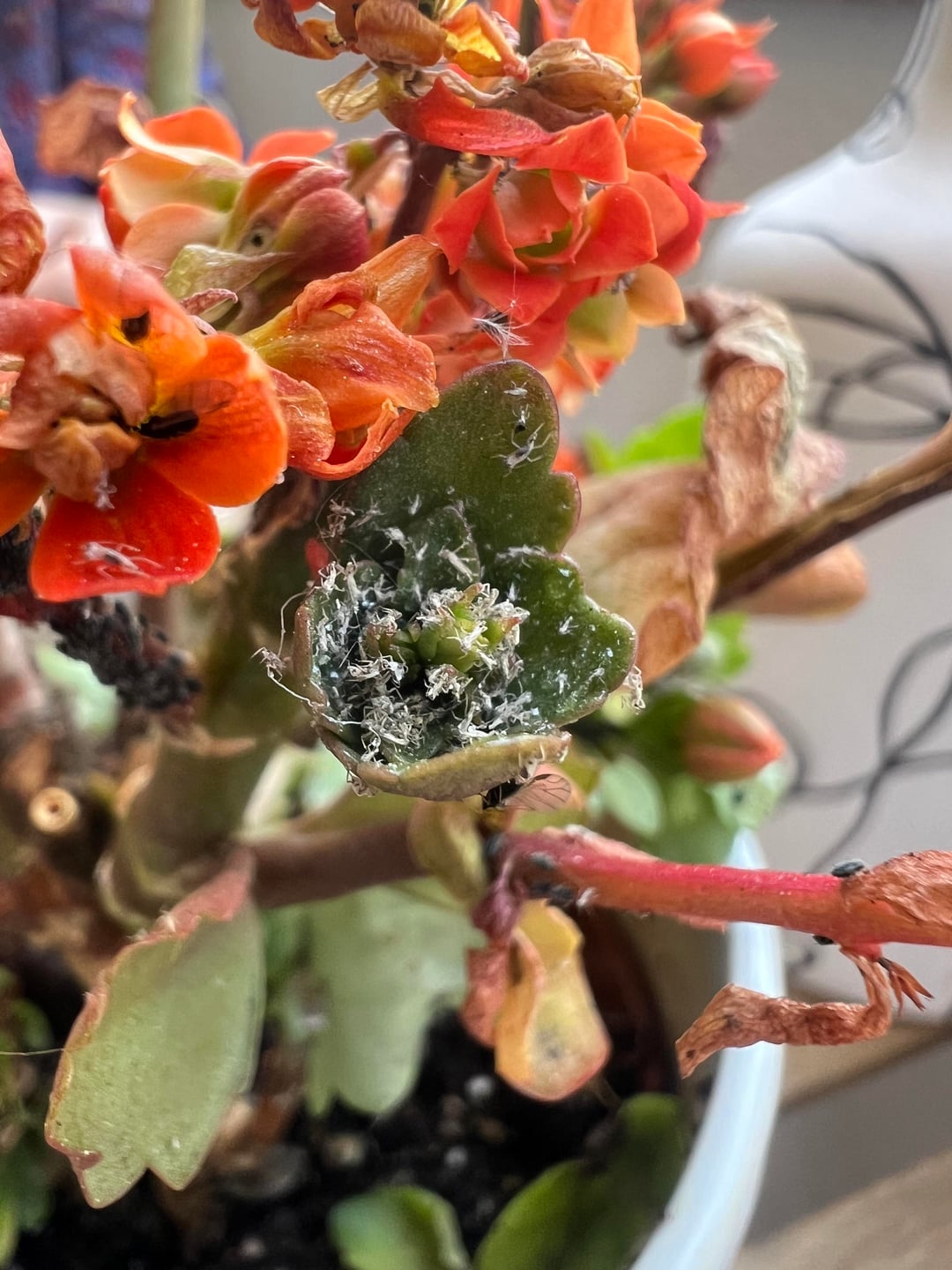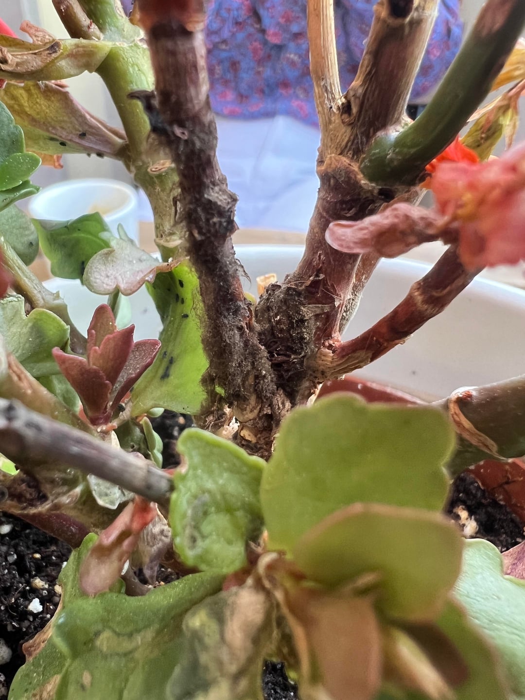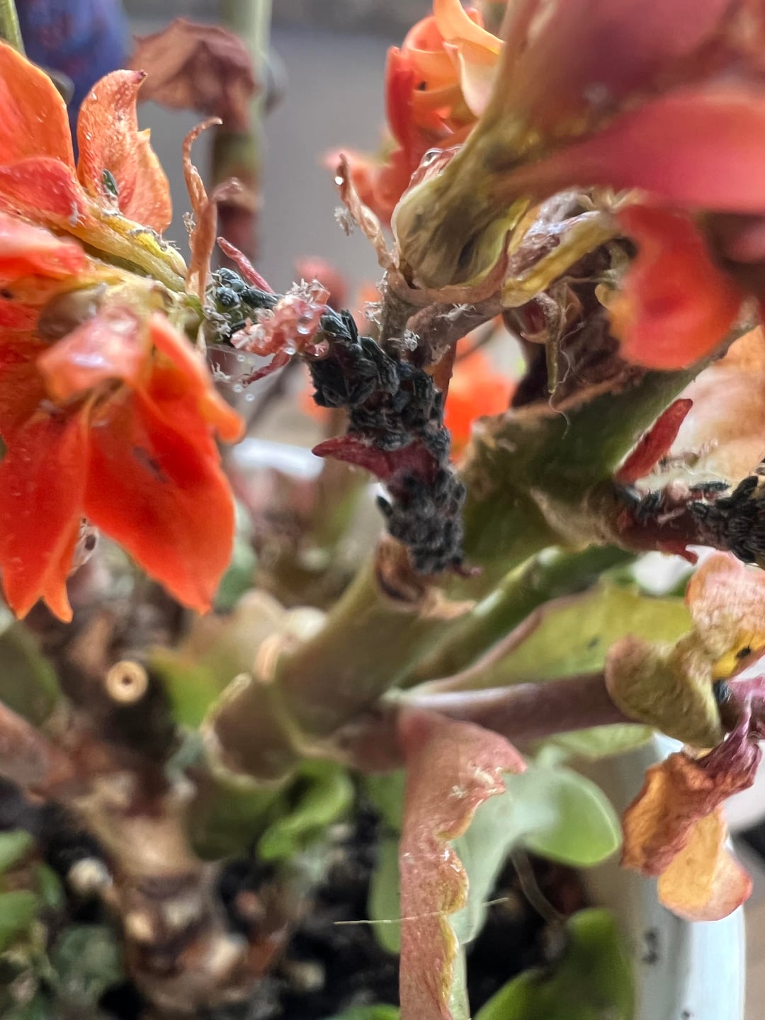 過去6か月間これらの花を育ててきましたが、花は咲き、完全に健康でした。 そして冬がやって来ました… 1ヶ月ほど前に主茎にカビのようなものを見つけましたが、春になって日が明るくなれば消えるだろうと思っていましたが、今は小さな白い斑点が発生しています。 回収可能ですか?