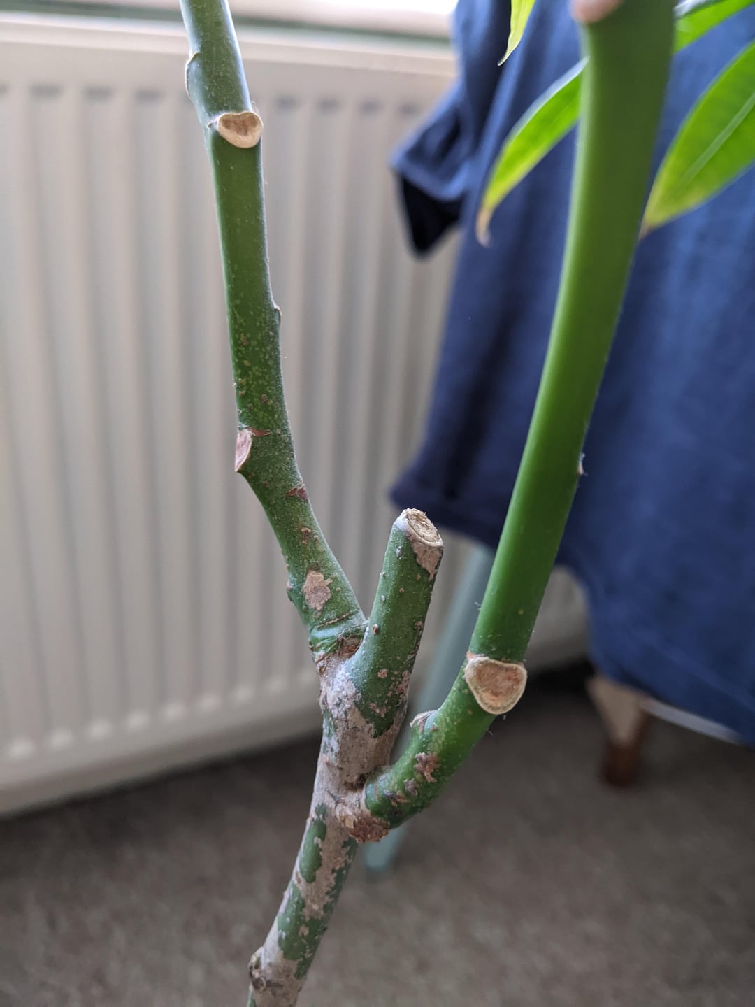 他の金のなる木の幹が腐った後に残った最後の幹。この硬くなった中心茎を切ったら、そこでの成長が促進されるのだろうか?