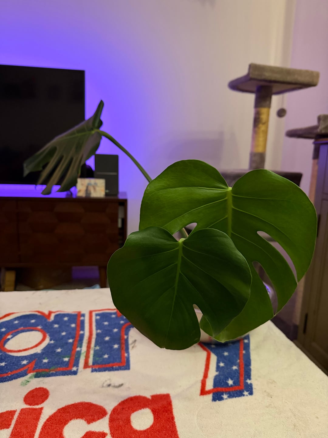 うちのモンステラの二枚の新葉が抱き合っています。背景の大きな葉が本来の繁殖です。これでいいですか?もっと別れるように優しく動機付けるべきでしょうか?