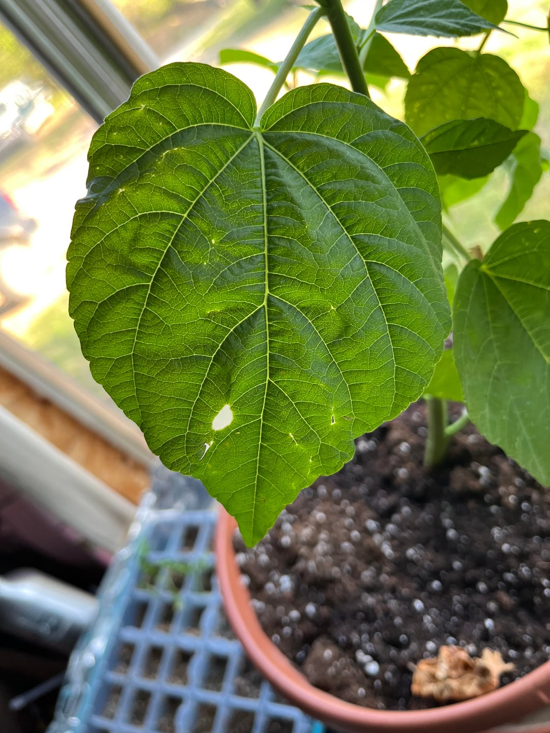 うちのハイビスカスには穴が開いていて、植え替えたばかりですでに苦戦中ですが、私は新しい飼い主なので、何が彼にとって最善なのかまだ考え中です。葉っぱに穴が開いているのを見て、最初は虫だと思いましたが、そのうちの2つの穴はとても大きかったので、もしかしたらうちの猫が知らないうちに部屋に入ってしまったのかもしれないと思ったのですが、誰か分かりますか?葉の下に虫は見えませんでしたが、顕微鏡レベルかどうかはわかりません。とにかく虫対策したほうがいいでしょうか?ニームオイルか石鹸水については読んだことがあります。