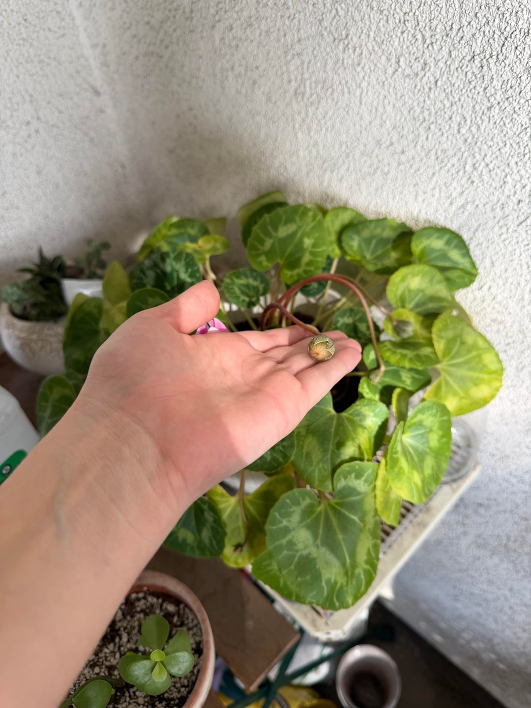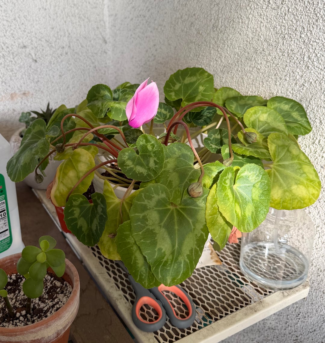 こんにちは、私はこのシクラメンを1年以上飼っています。ほとんどの葉を失い、新しい大きな葉が再び生えてくるというサイクルを経ています。順調に育っていると思ったら、また花が咲き始めました。でも今は、あまり幸せではないような気がします。誰かケアのヒントがあればと思いました。最近、暑い日の日差しでショックを受けたのか、移動させて水やりをしたので、まだ少しは回復中かもしれません。しかし、いくつかの花は詰まっていて咲いていないようです。肥料の提案はありますか?適切な時期ですか?植え替えたほうがいいでしょうか?いくつかの調査をしましたが、誰かがそれを持っていて、何が効果的かを知っているかどうか疑問に思っていました。