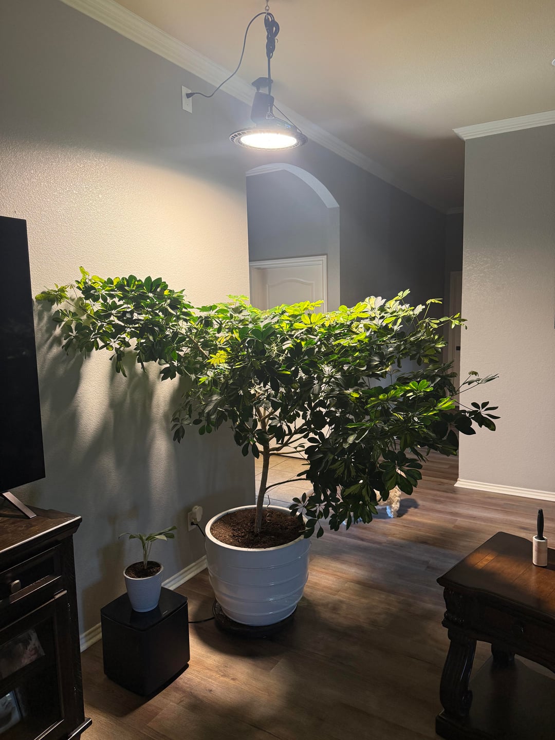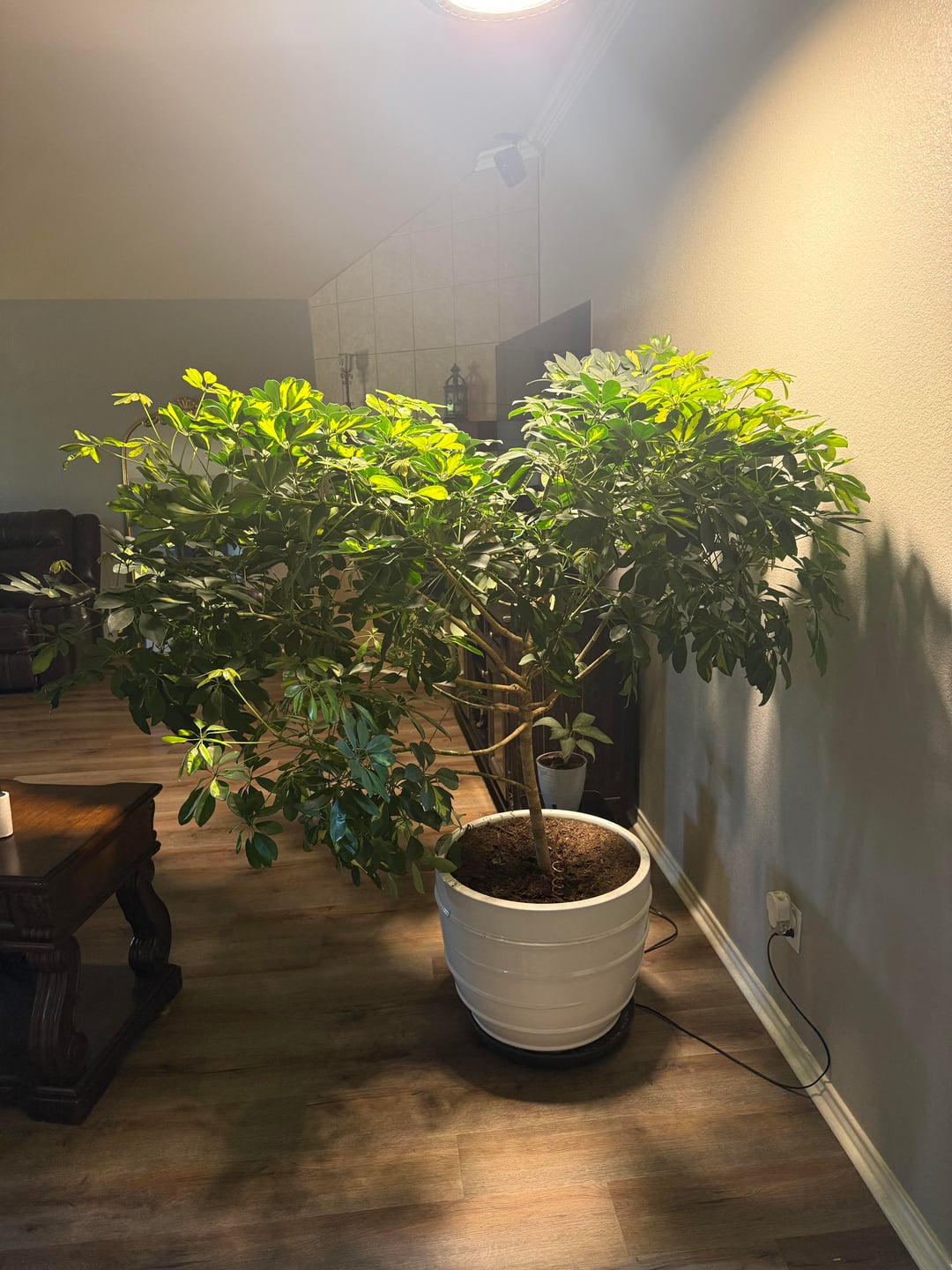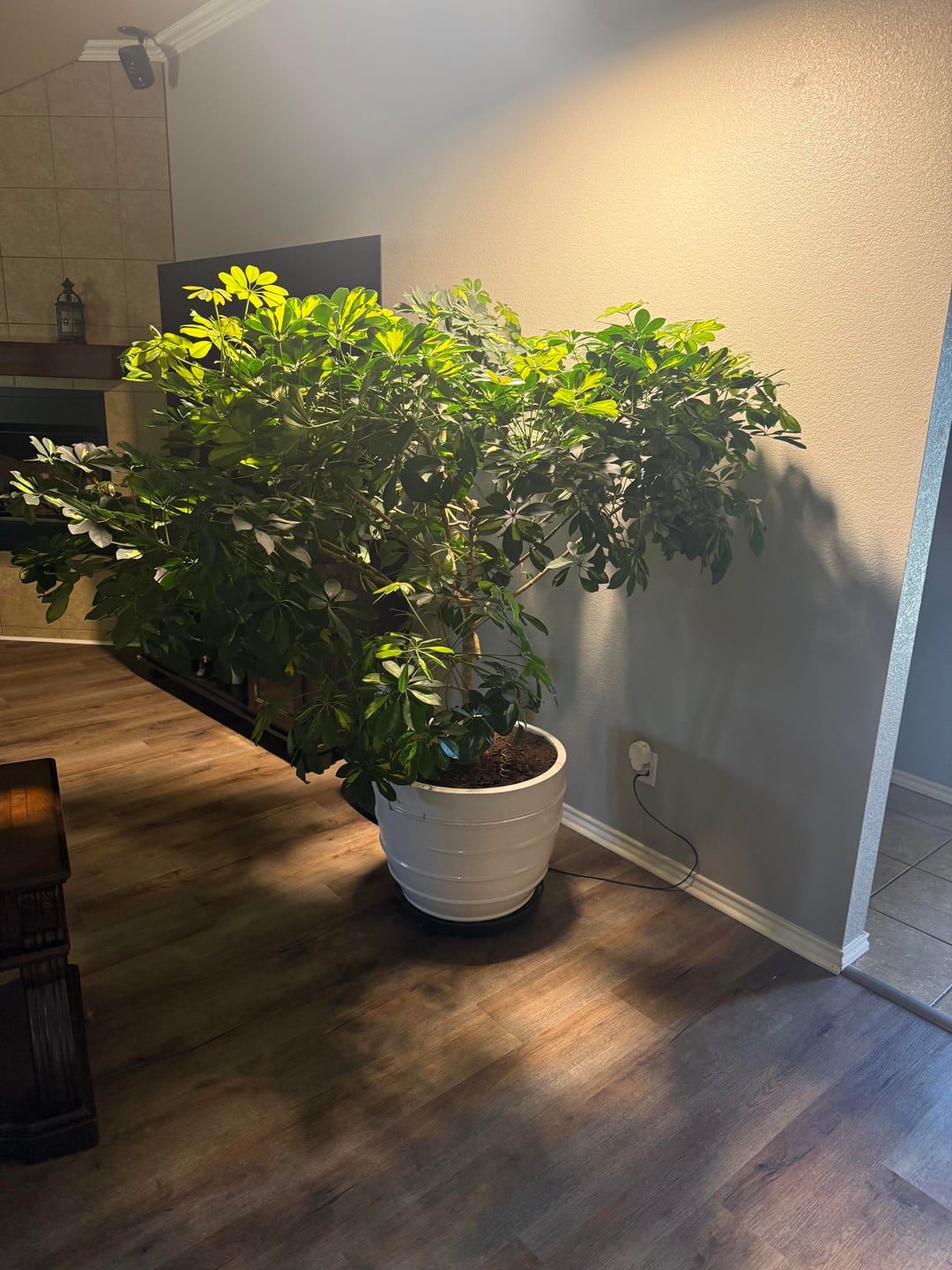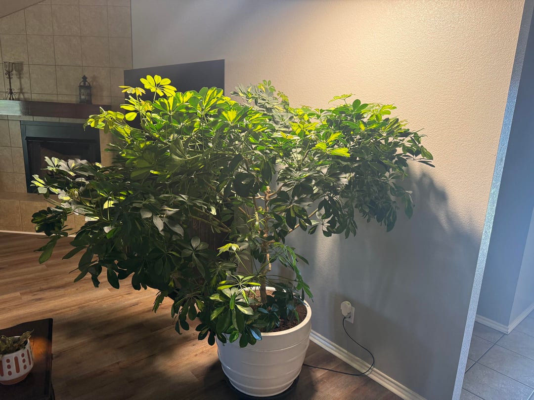 私のドワーフシェフレラは垂直に成長せず、水平にしか伸びないようです。彼女を飼って4年になります。 1年前にグローライトを設置しましたが、35%の状態です