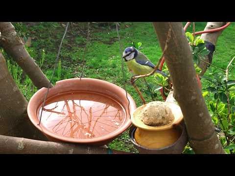 ここにいる間、かわいい青いシジュウカラが餌をあげたり、お風呂に入ったりしに来ます。