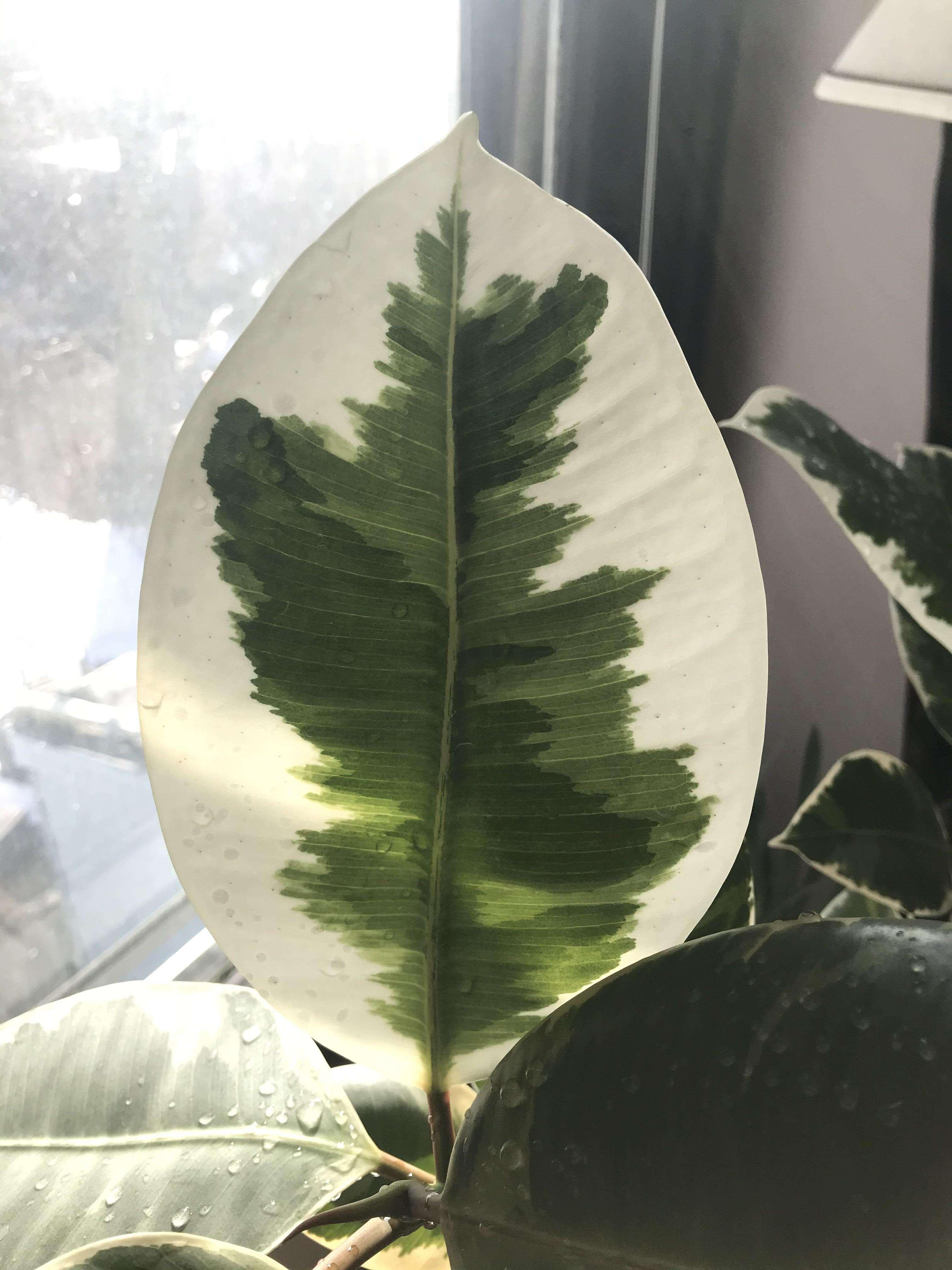 お気に入りの植物のお気に入りの葉っぱ。白い葉に緑色の水彩絵の具を塗ったように見えます。