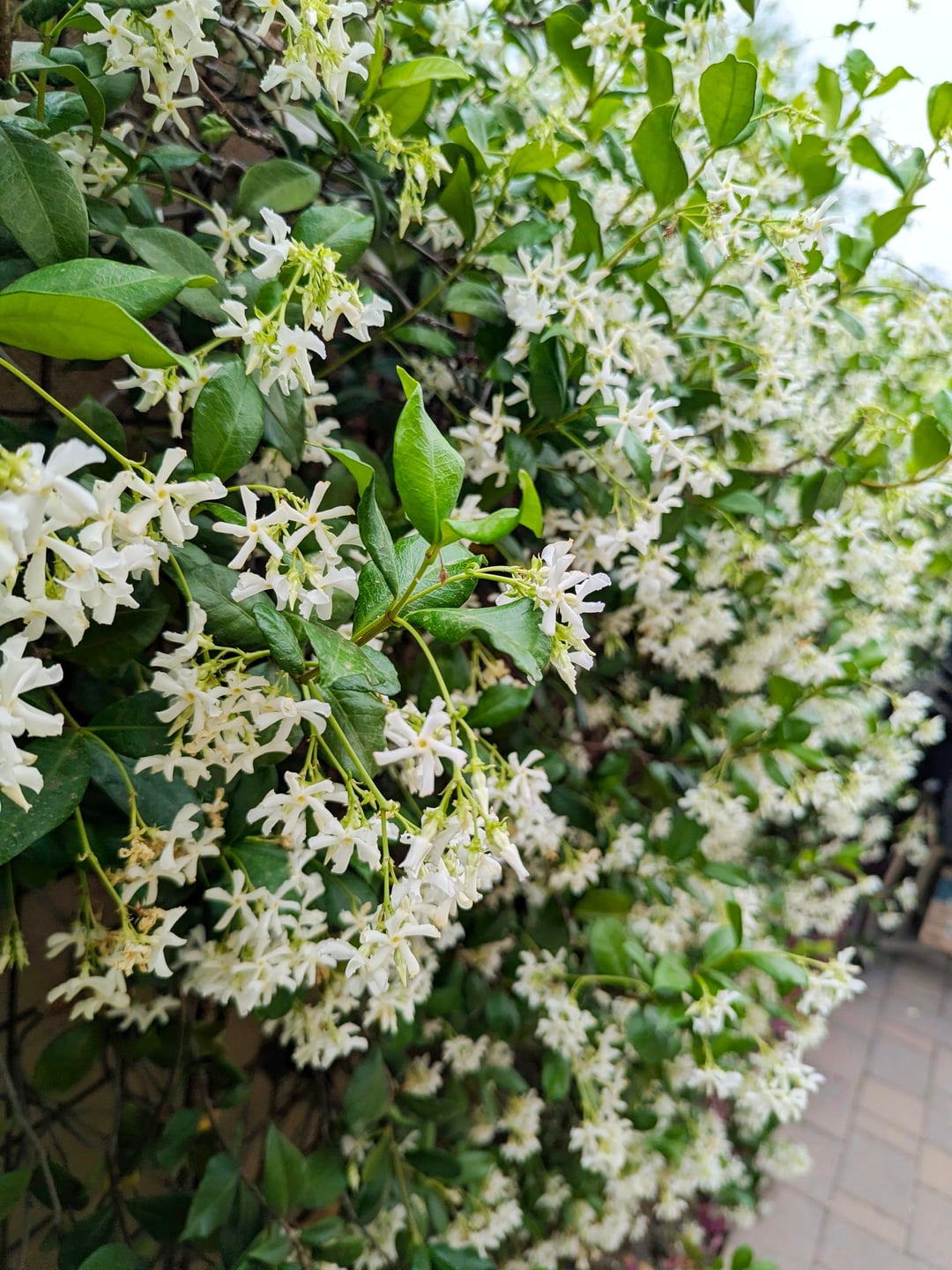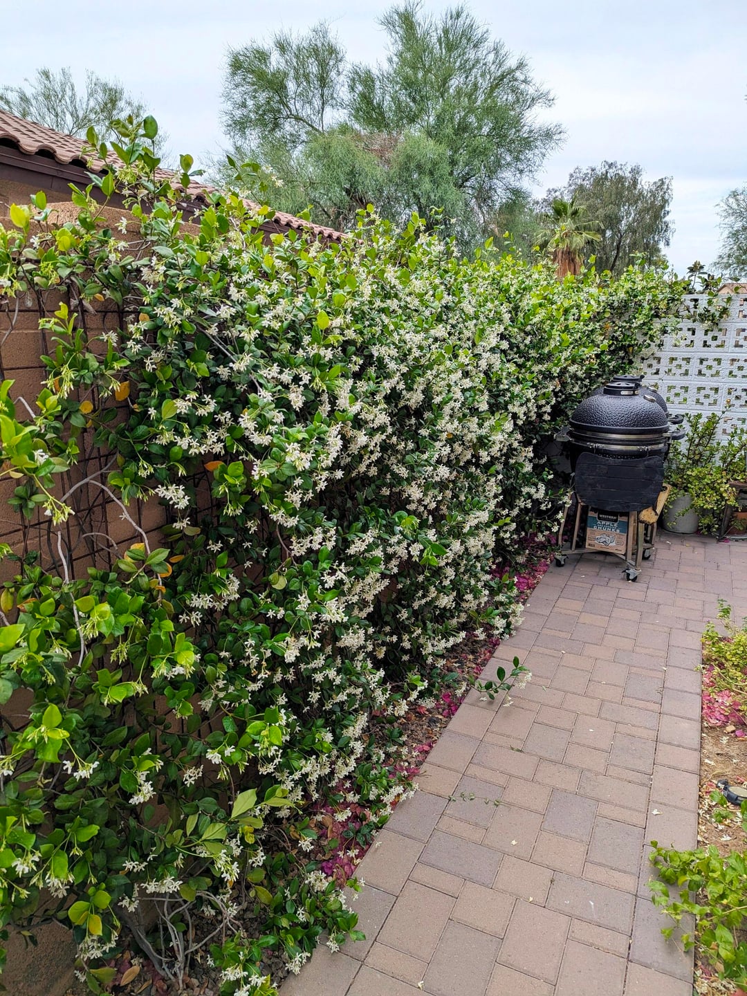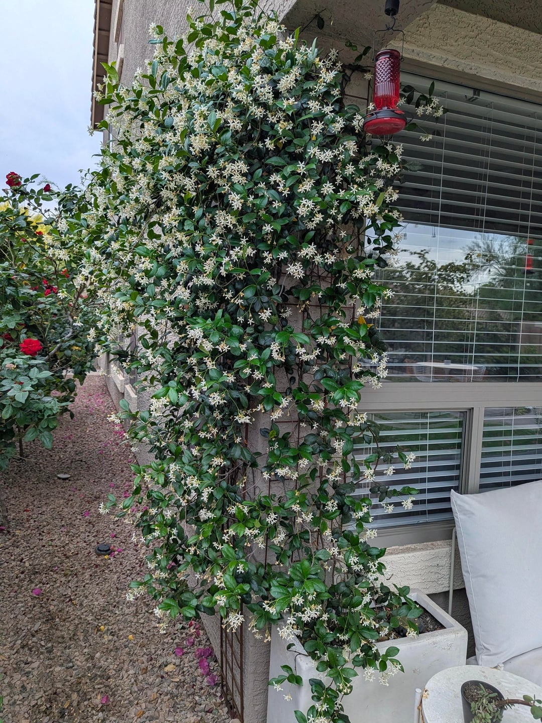 トレリスの壁と鉢植えのトレリスジャスミンはまだ元気です。アリゾナ州ギルバートにあります。夏には東/西の照明がそれらをうまく保護します。神の匂いがする!