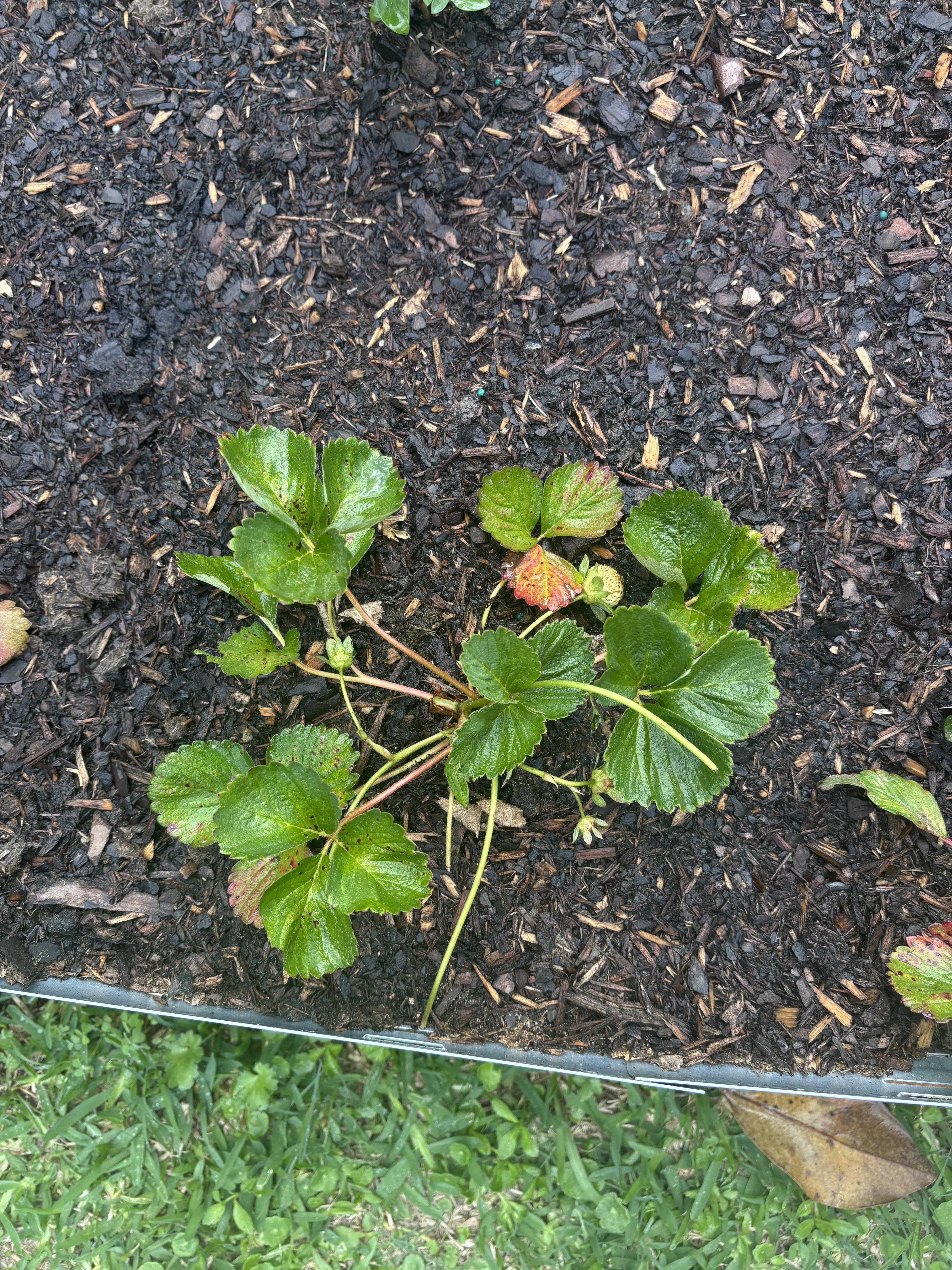 初めての庭師はここにいます!私たちは、3 月 26 日にこれらのイチゴを 2 個、レイズド ベッドに植えました。葉が赤くなり始め、害虫が果実を食べるまでには、わずか数週間しかかかりませんでした。失敗したような気がしてきました(笑)。