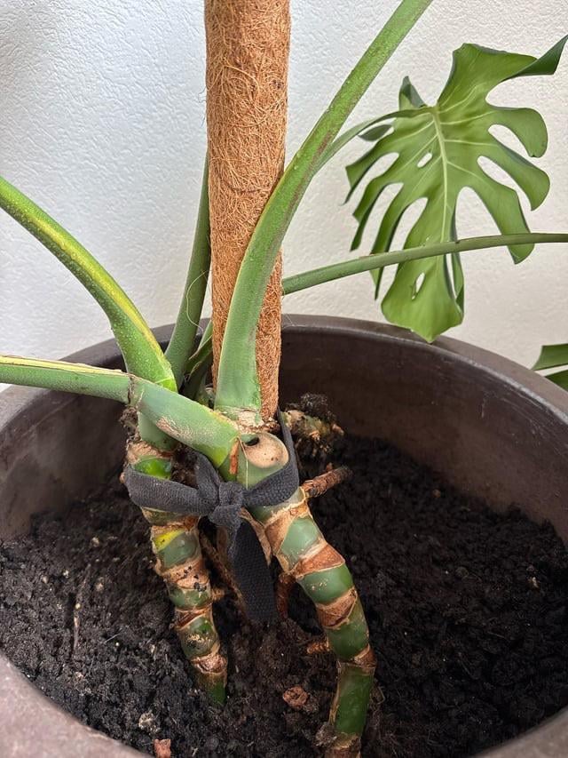 葉を12枚近く切り(一番大きなものは約60センチ)、枯れた根もたくさん取り除きました。その後、モンステラに適した水はけの良い用土に植え替え、支柱を立てました。この植物はかなりねじれた4本の主茎で構成されているため、気根を土の中に向けて支えたり、支柱にくっつくことができるようにしたりして、できる限り最善の方法で植え替えました。