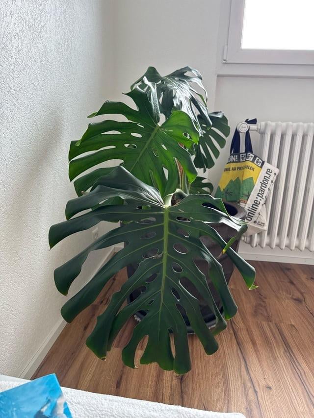 2週間前に大きなモンステラ・デリシオサを保護しましたが、状態はかなり悪かったです。少なくとも5年以上は植え替えをしていませんでした。鉢はとても小さかったので、土はほとんど残っていませんでした(圧縮された土と乾いた根だけ)。根が場所を占領していて、完全に鉢の中に詰まっていました。支柱がないので植物は登ることなく四方八方に伸びていました。