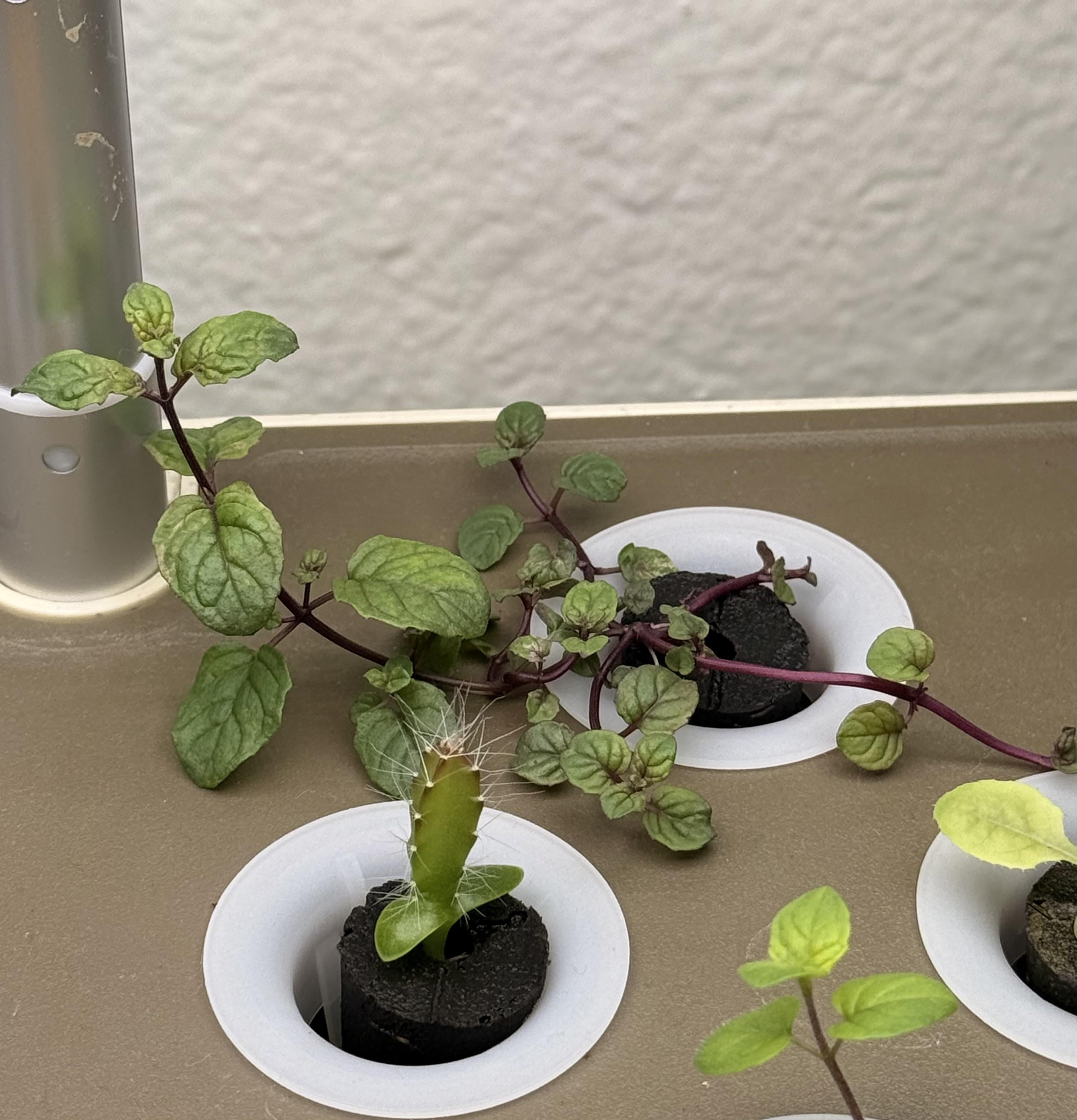 この種まき用の水室の容器にスペアミントの種を植えると、芽が出ました。今はこんな感じですが、スペースを超えて成長しているような気がします。見た目はかなり伸びているので、剪定したほうがいいのか、植え替えたほうがいいのか、迷っています。助けてください!!
