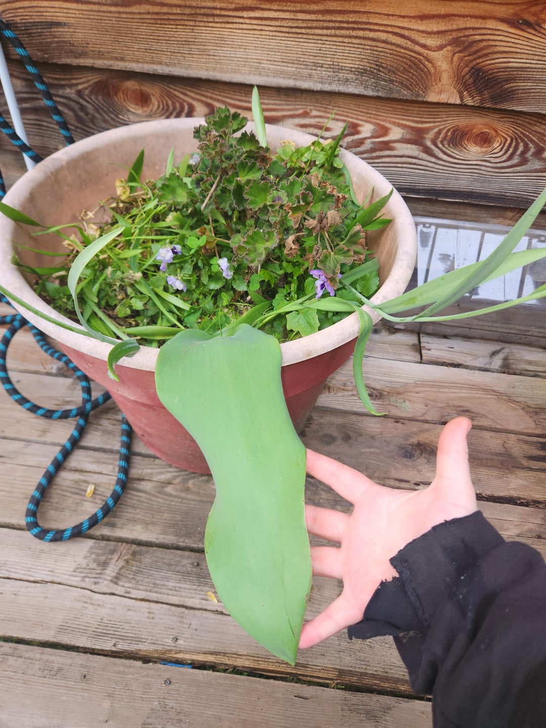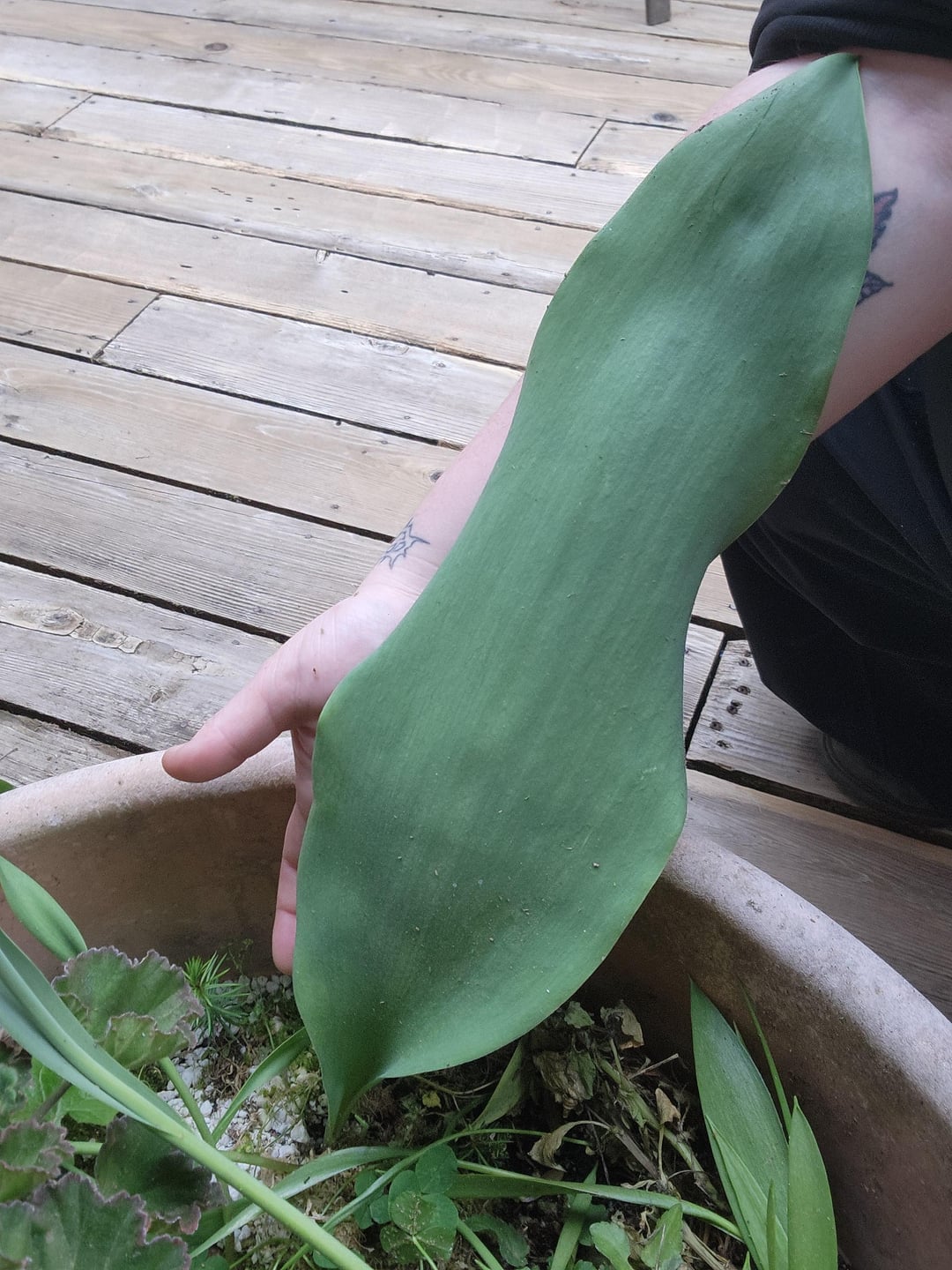 去年このチューリップを植えて、普通に成長して綺麗に咲きましたが、今年は巨大な葉が1枚だけで、他には何もありませんでした。他のチューリップはすべて普通に成長し、葉はこのチューリップに比べて小さいです。