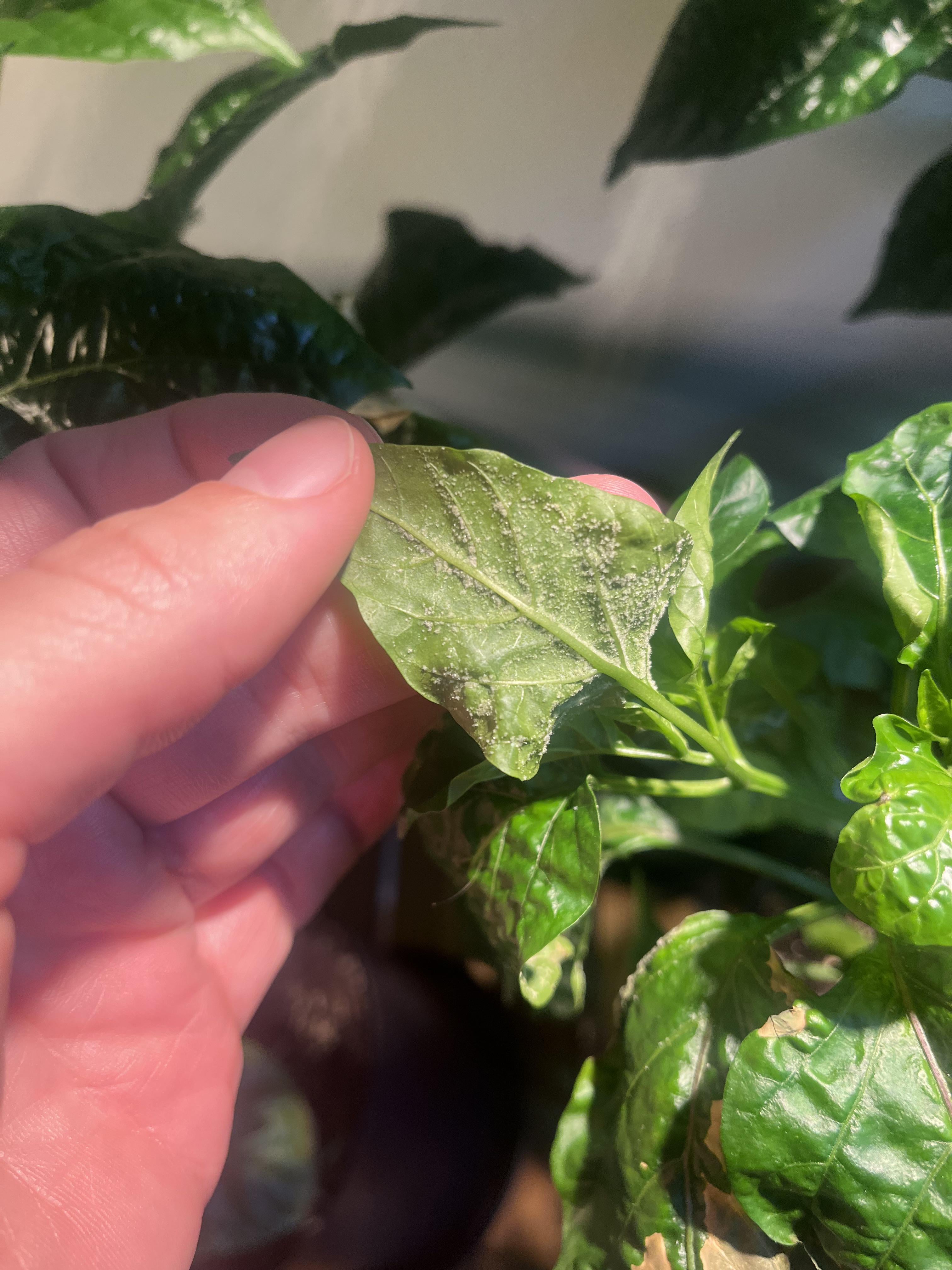 植物に慣れていないのですが、私のチリプラントの 1 つは葉の下にオフホワイトの粉塵があり、一部の葉は乾燥しています。小さめの新葉が元気そうです。ハダニでしょうか?